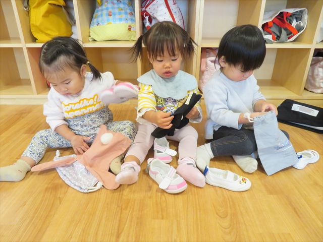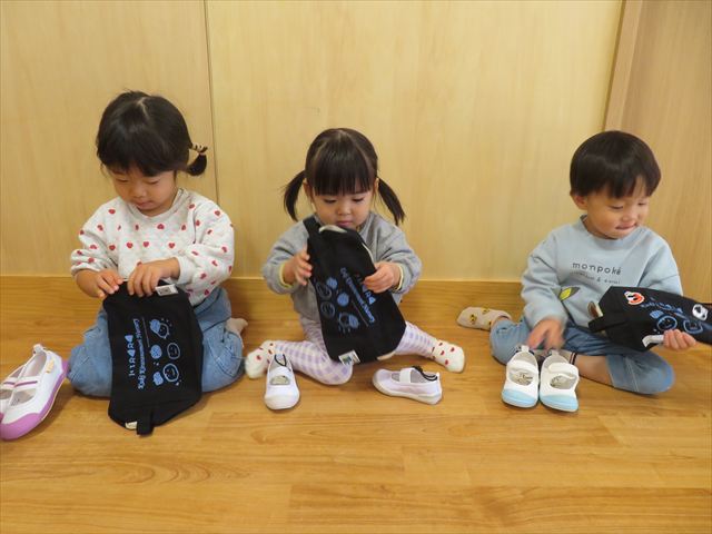 金曜日になると、自分たちで上履き袋の中に入れる練習もしています!