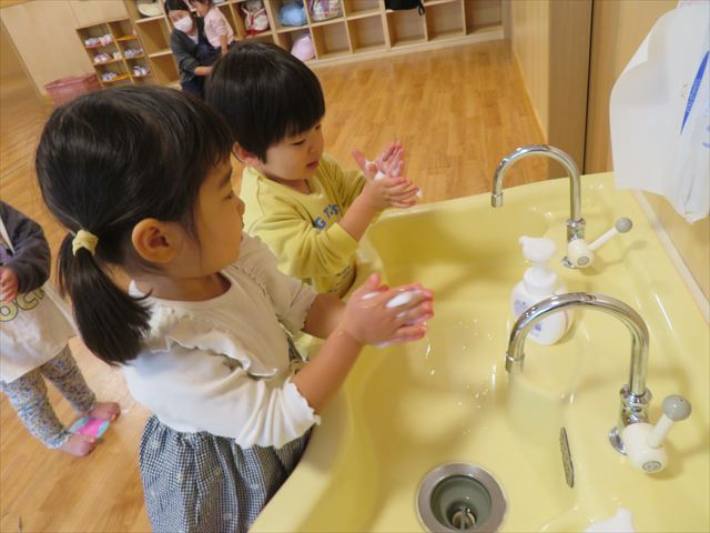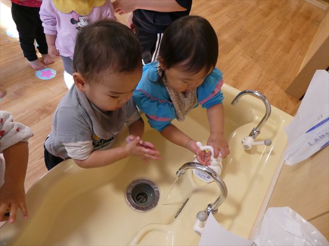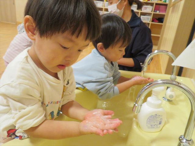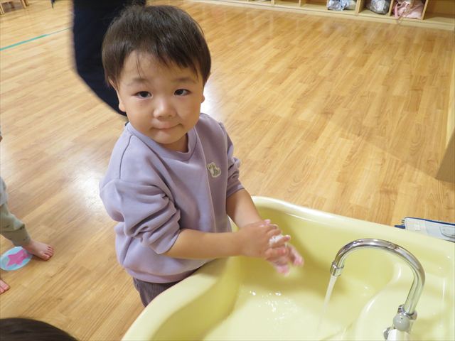給食を食べる前に手洗い。腕まくりシャッキーンが上手になりましたよ。