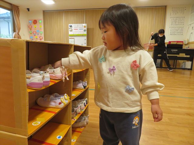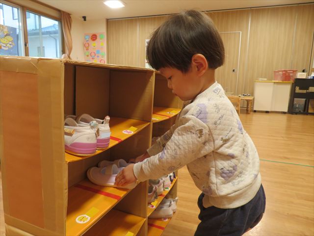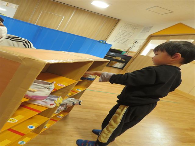 また、上履きを手作りの靴箱で管理をしていますが、自分のマークシールの所にしまう事も上手に出来るようになりました♪