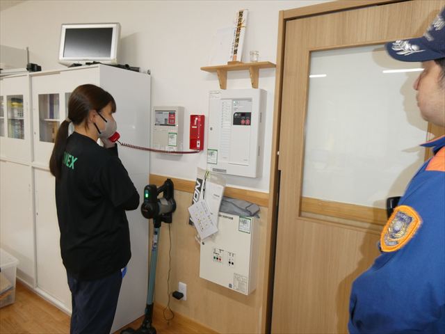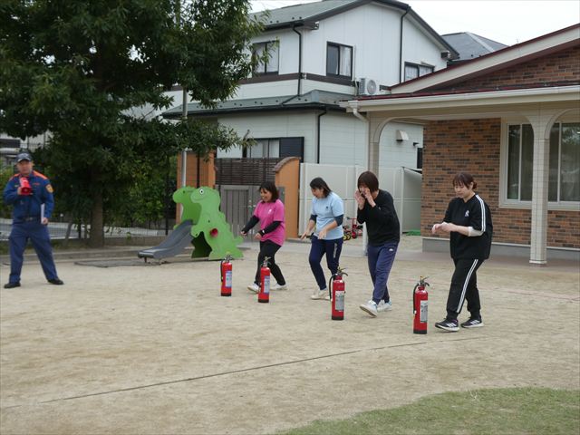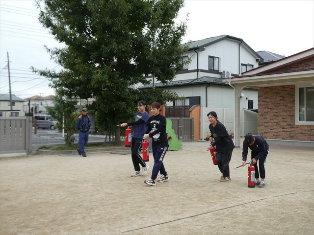10月21日(水)に火災避難訓練・消火訓練を行いました。今月は消防士さんに来ていただき、火災発生を想定した避難訓練や消火訓練と実際に通報訓練も行いました。