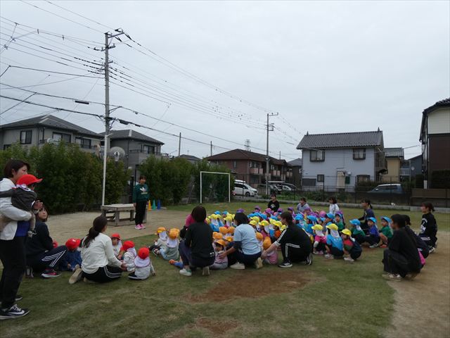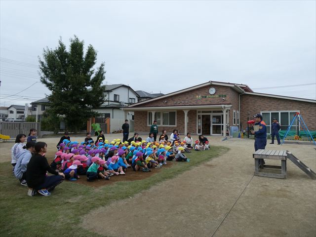 給食室からの出火を想定して行われ、今回は朝の集い時だったのでそのまま園庭の中央に避難しました。