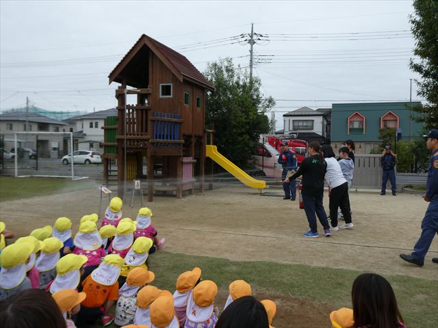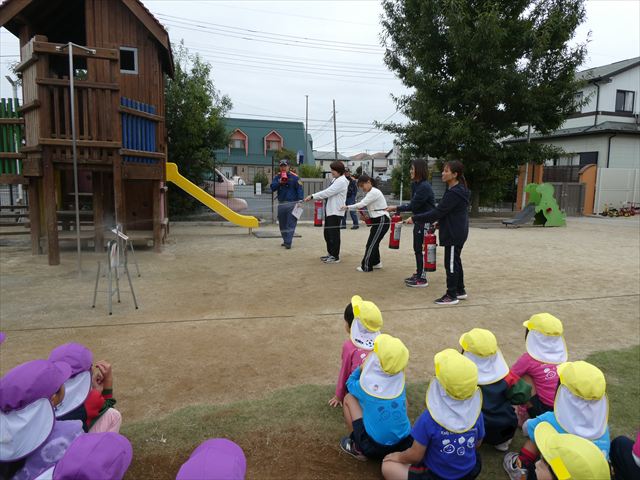 先生たちが順番に水消火器を使って消訓練を行うと、子どもたちは「がんばれ~!!」と応援していましたよ(*’▽’)子どもたちが見守るなか、無事に消火することができました!