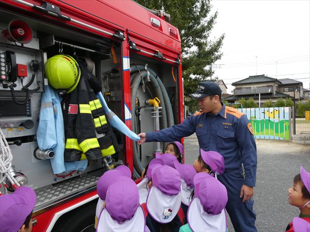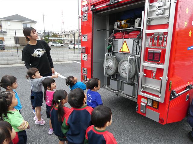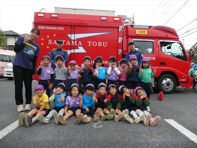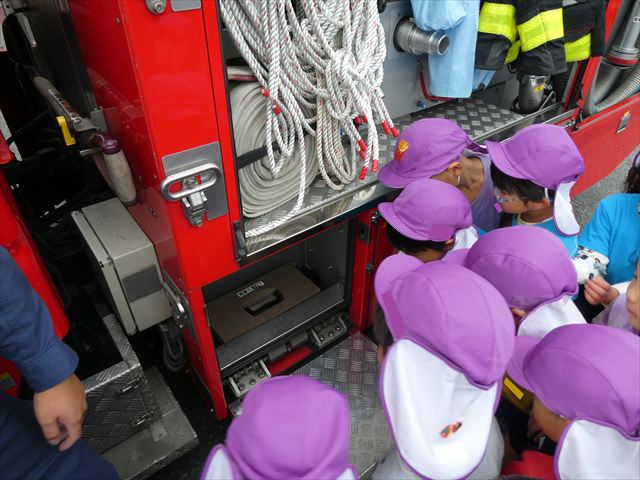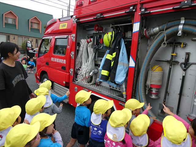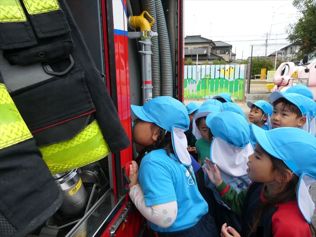 花組さんから順番に消防車や消防士さんと一緒に写真を撮ったり、消防車の見学をしました!いろいろな装備や資機材などに興味津々☆虹組さんは「これは何ですか?」「ここには何が入っているの?」と積極的に質問をしていましたよ(^O^)