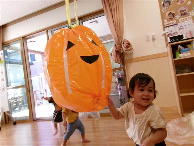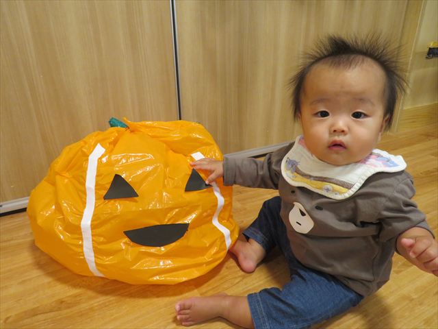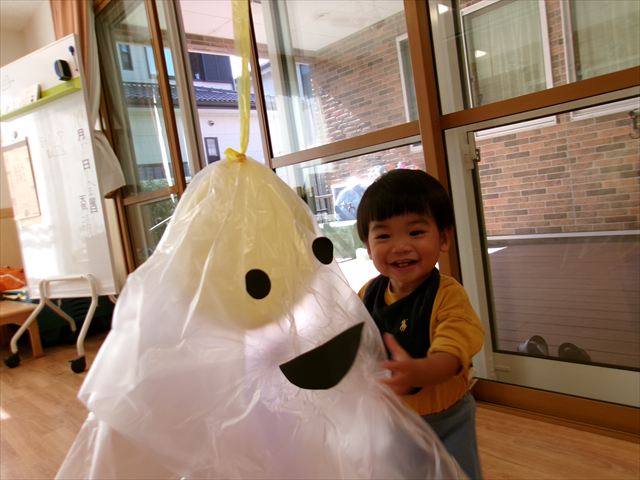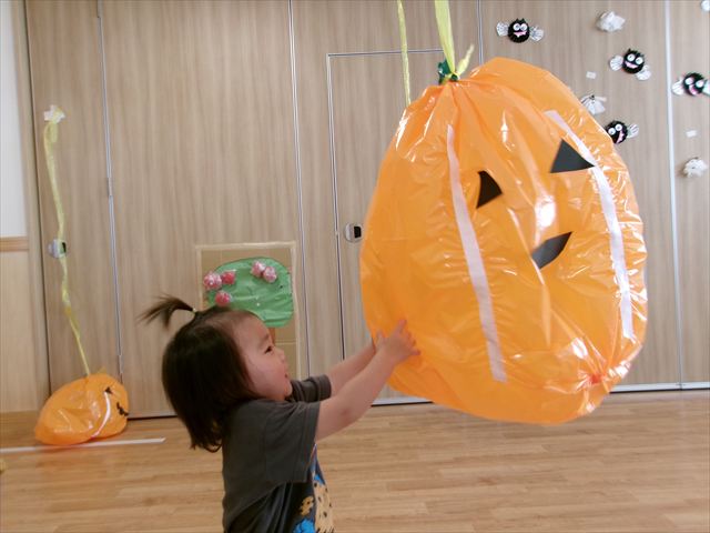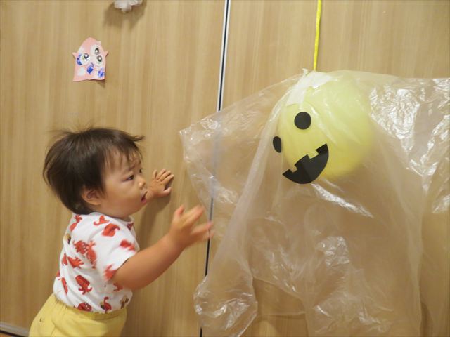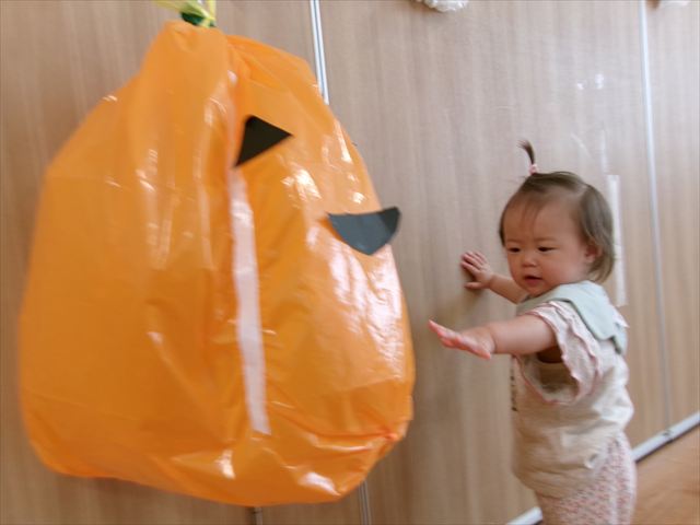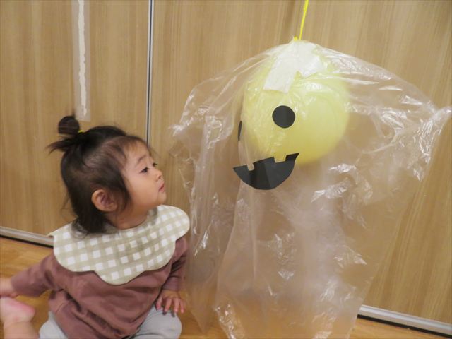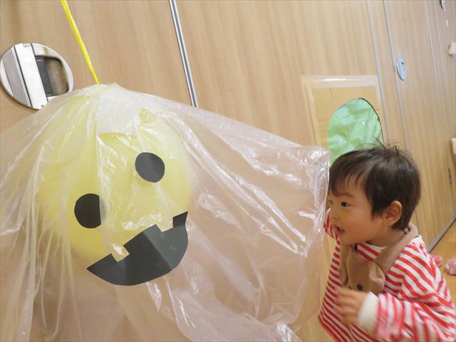 ポリ袋で作ったジャックオーランタンやお化けを見ると、大興奮な子どもたち。元気よくパンチをしたり、恐る恐る触ってみたりと色々な反応が見られました。