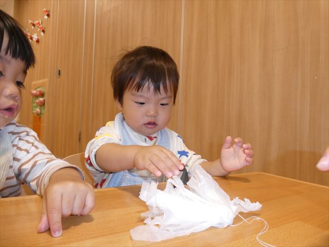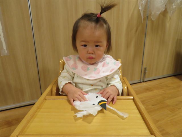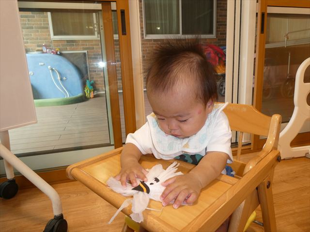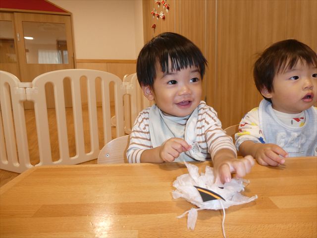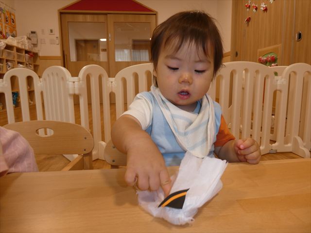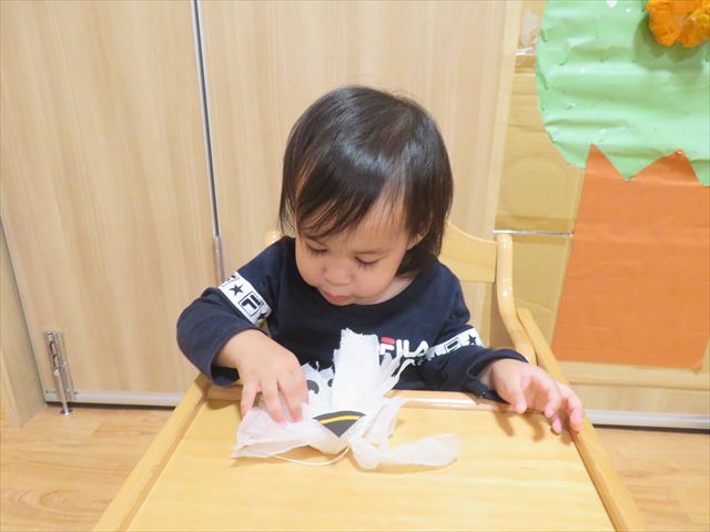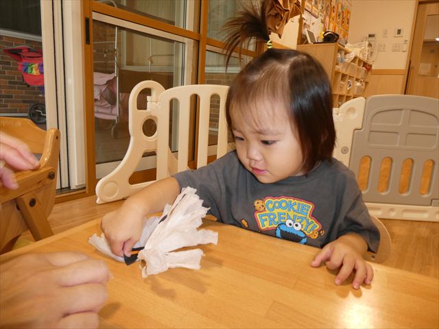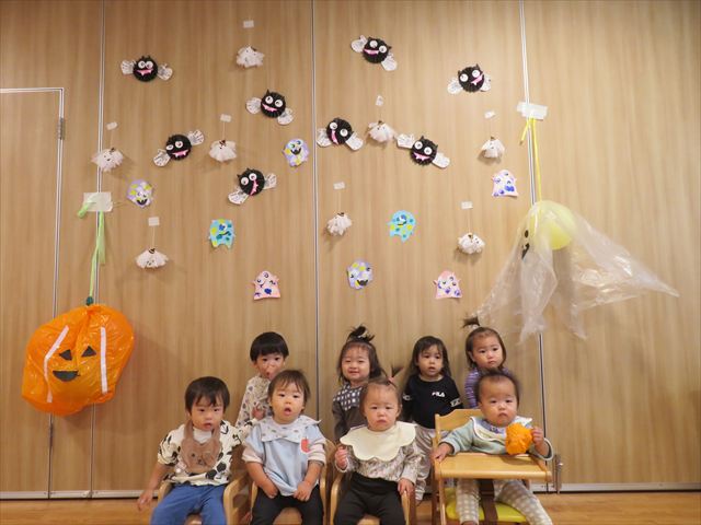 10月31日はハロウィンですね。行事にちなみ、お化けの壁面を製作したり、ポリ袋で作ったおもちゃで遊んだりしました。指先が器用になり、小さいシールも先生と一緒に上手に貼れるようになってきました。他にもモンスターやコウモリを作り、お部屋の中はハロウィン一色です。