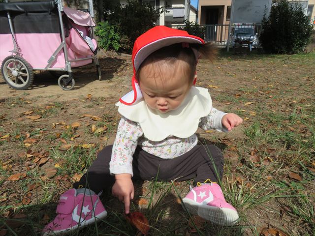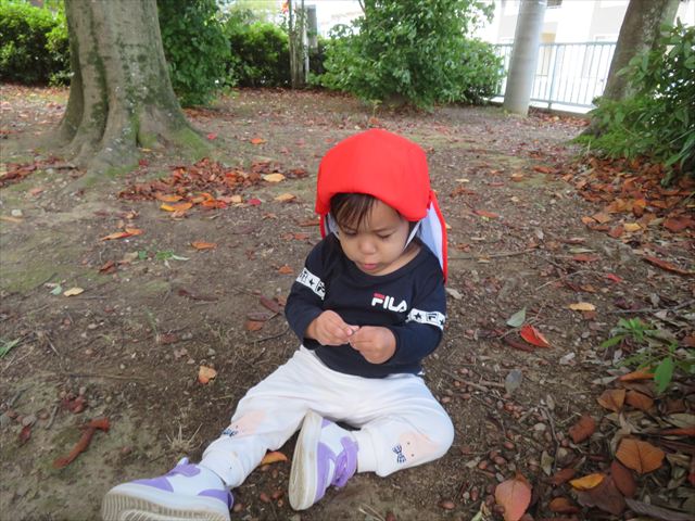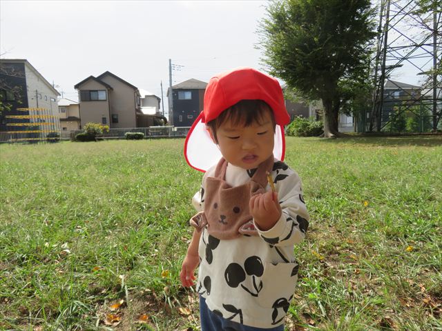 日中もすっかり涼しくなり、秋が深まってきました。お散歩をしながらコスモスを見たり、落ち葉を拾ったりと子どもたちも秋の自然を楽しんでいます。