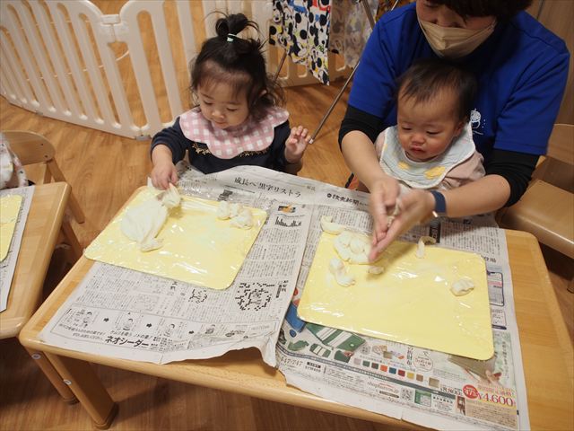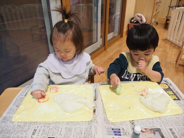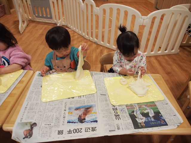 初めての粘土に、興味津々で豪快に触る子、恐る恐る触る子、嫌がる子など、様々な反応が見られました。