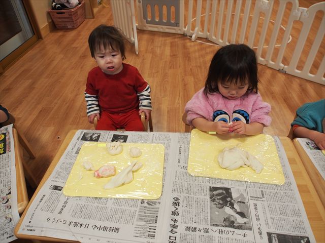 2月中旬には作品展があり、雪組から製作する粘土に興味を持って見ていた子どもたち。ということで、花組でも、小麦粉粘土で遊んでみました♪