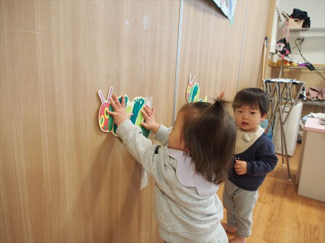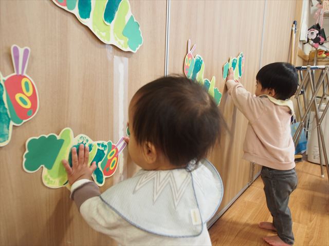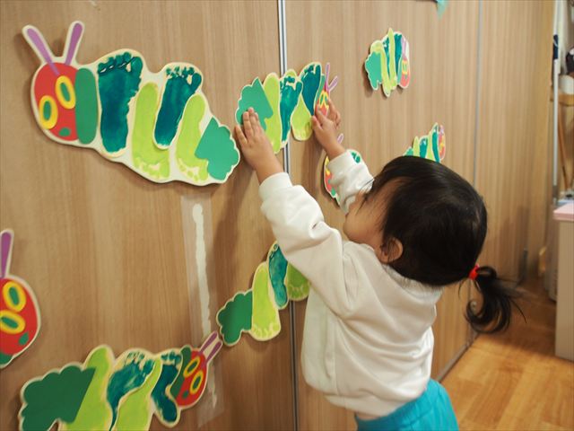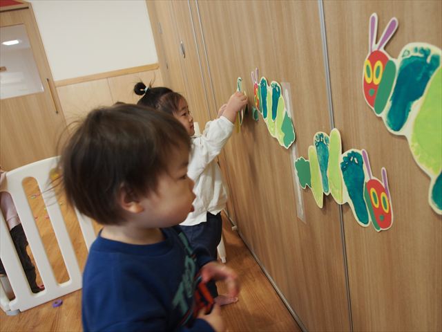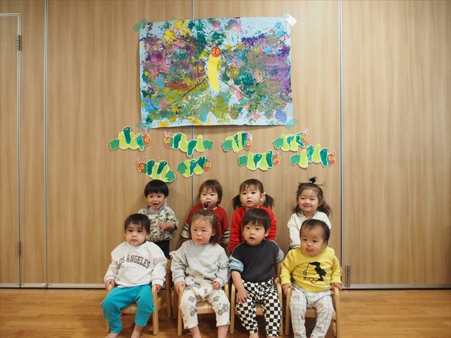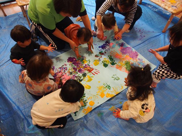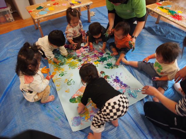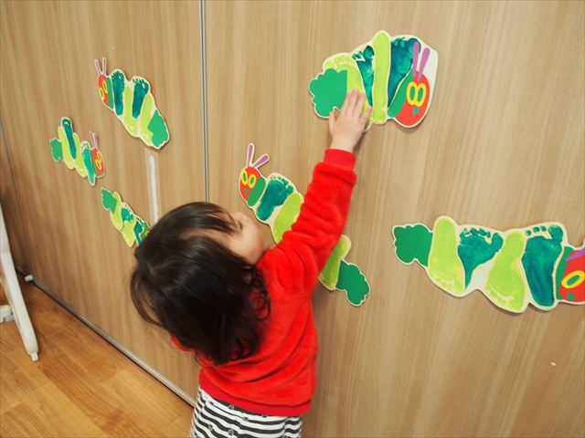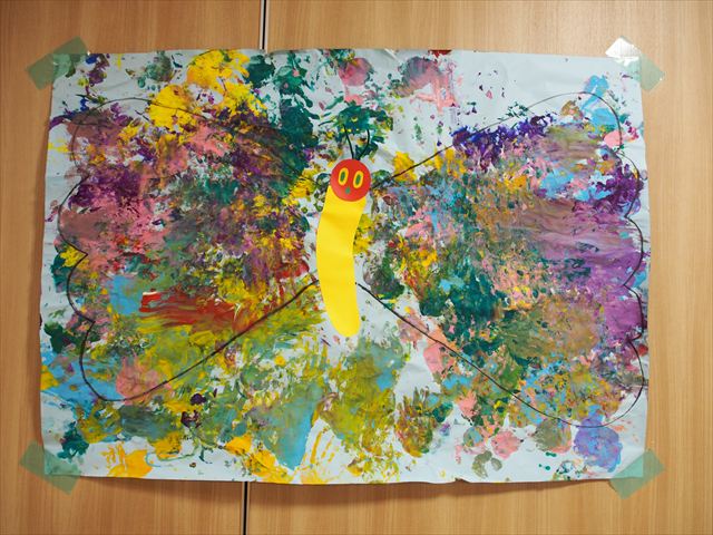 みんなで初めての共同製作!はらぺこあおむしが最後に変身する蝶々の羽に、みんなで手形スタンプを押しました。始めはいろいろな色の絵の具で控えめにペタペタッとしていた子どもたちでしたが、慣れてくると楽しくなってきて、自分で手に絵の具をつけたり、手形を押したところを足で踏んでみたりと汚れも気にせず、全身で楽しんでいましたよ(笑)