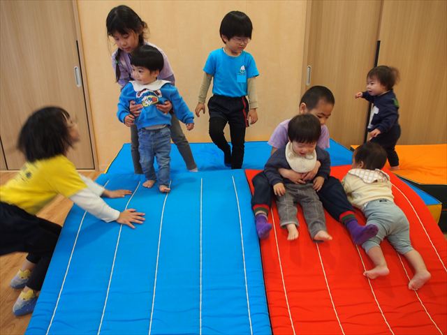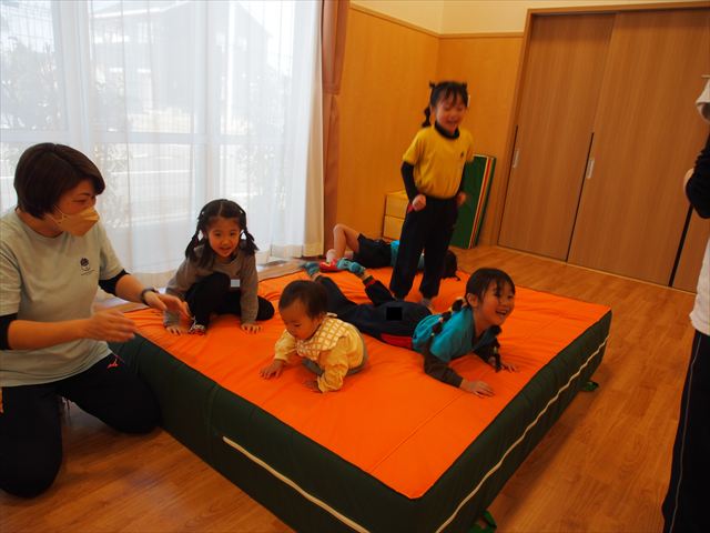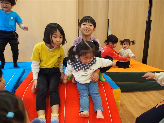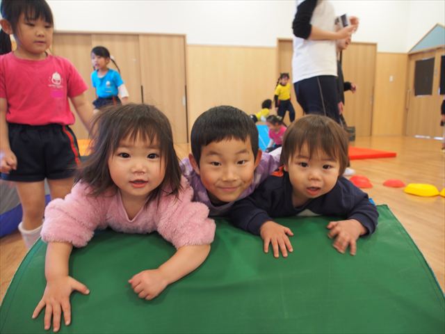 もうすぐ卒園してしまう虹組さんと遊びました。以前にも遊んだことがあり、前回は虹組のお部屋で遊びましたが、今回はホールにマットやトンネルなど出して、広々と遊びました。