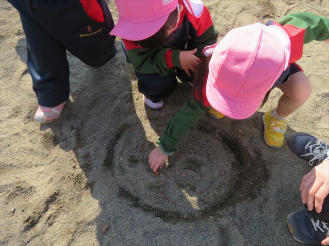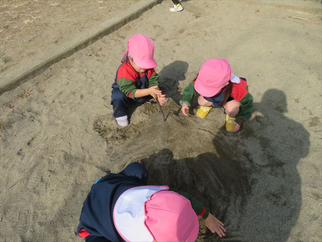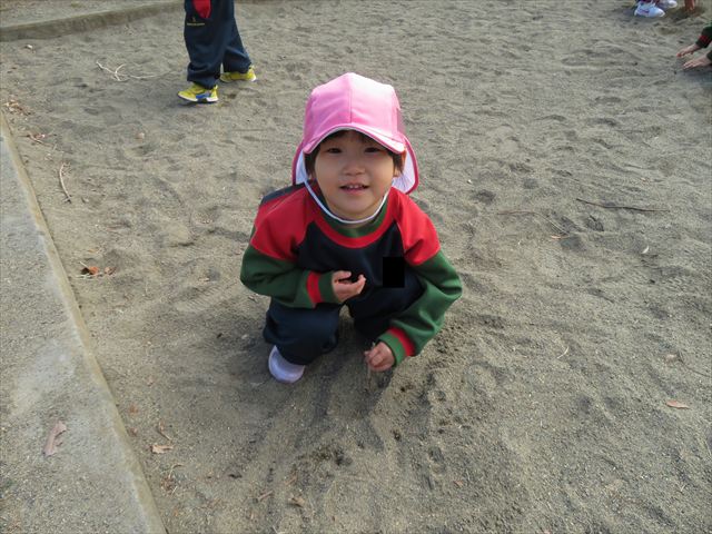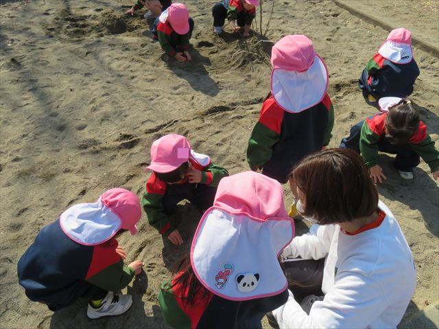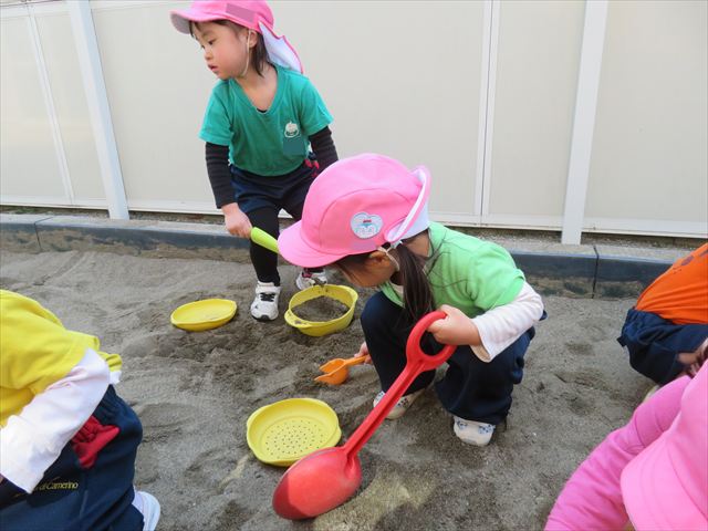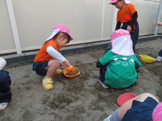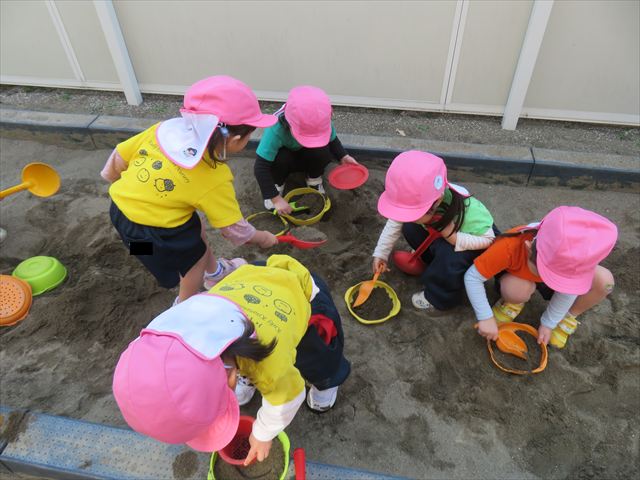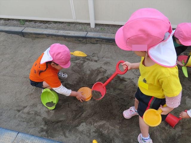 戸外遊びでは、砂場遊びも楽しみました♪みんなで協力して大きな山を作ったり、カップやバケツに砂を入れてケーキを作って遊んでいました!