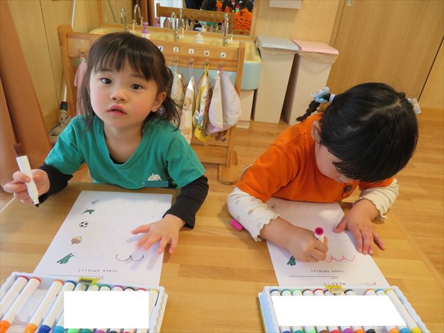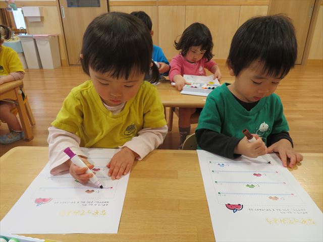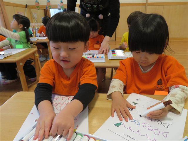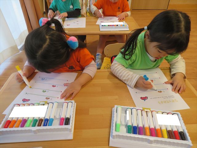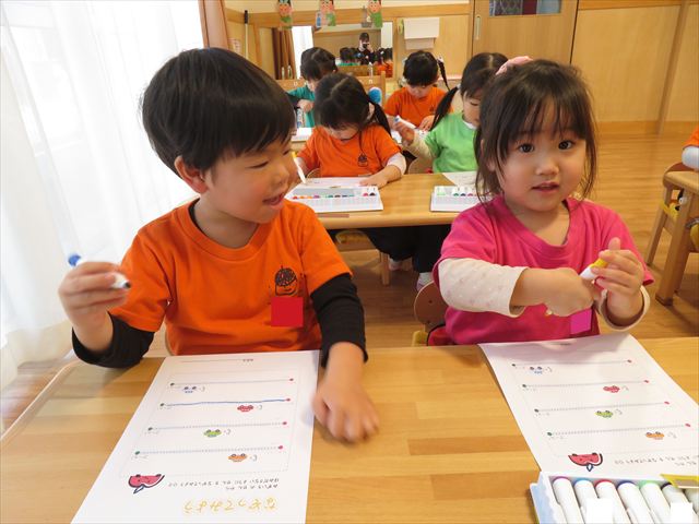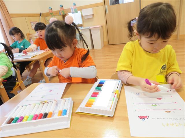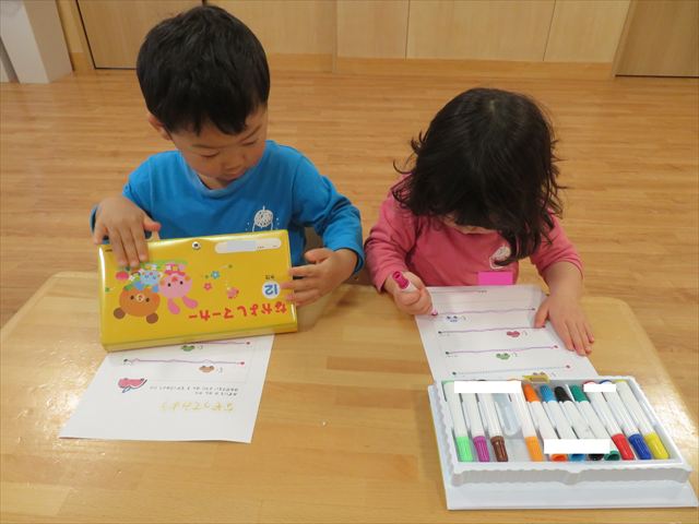 初めてのプリントに興味津々の子どもたち^_^好きな色のマーカーを使って、線の上をなぞる練習を行いました!みんな真剣に活動に取り組むことが出来ましたよ☆