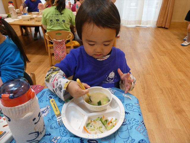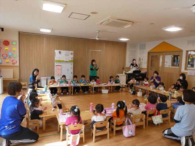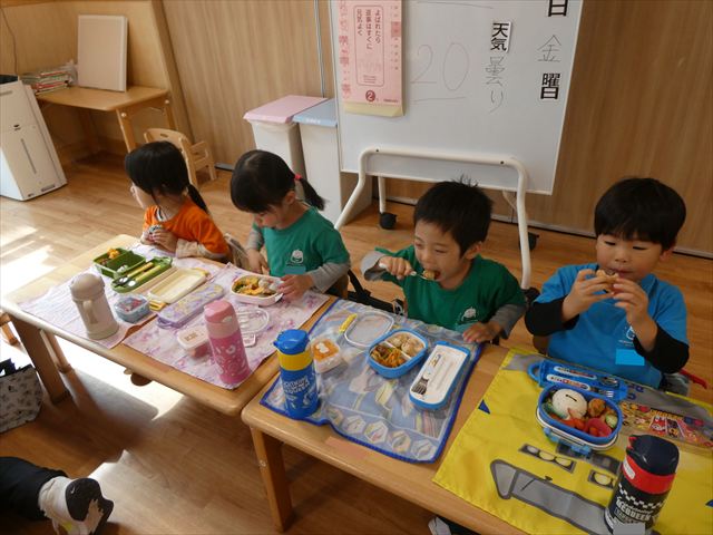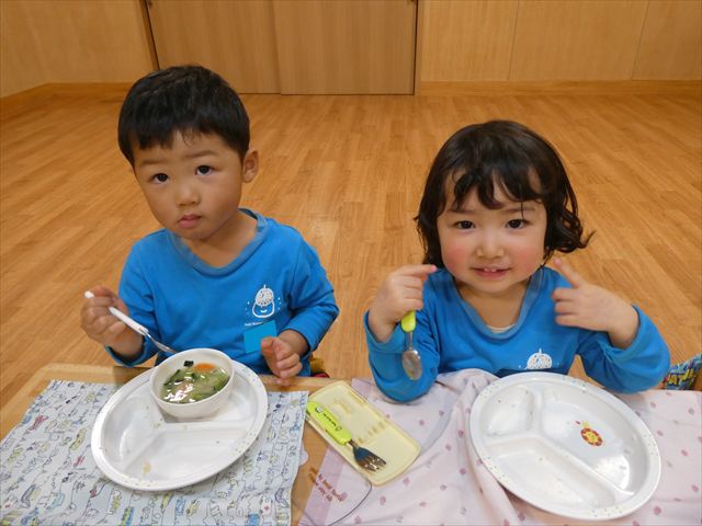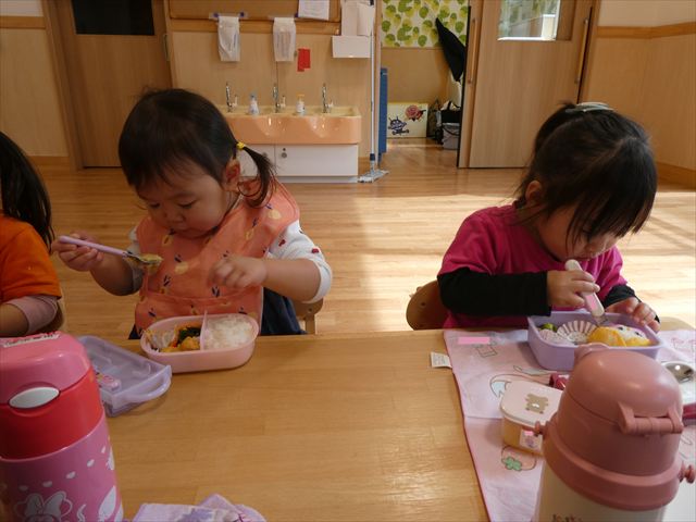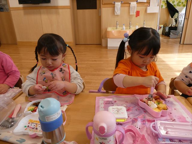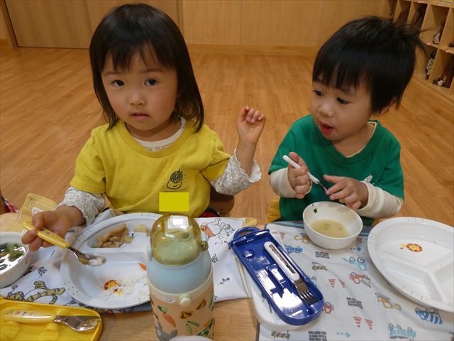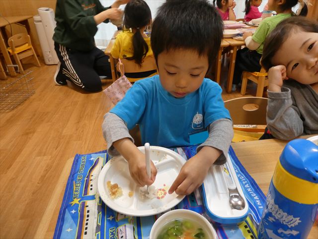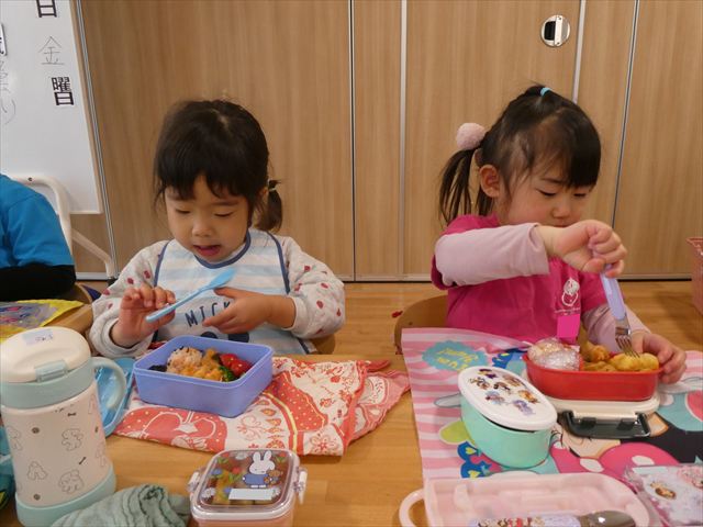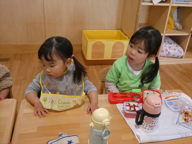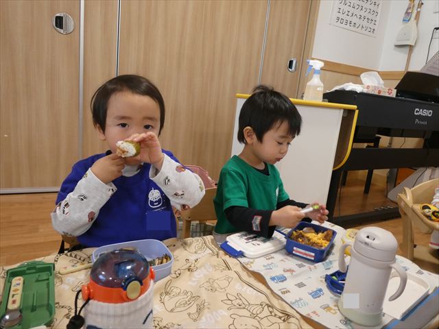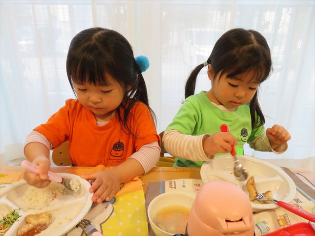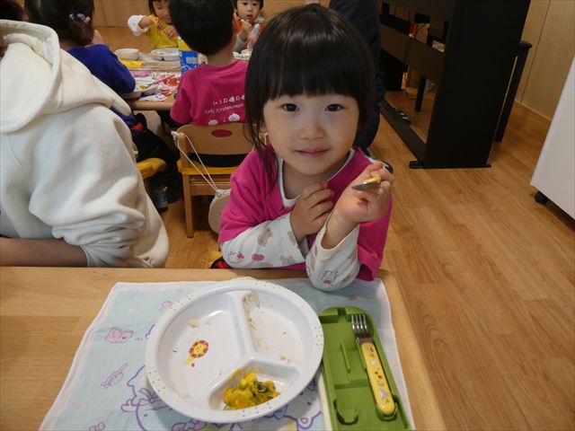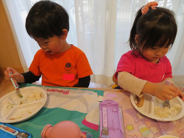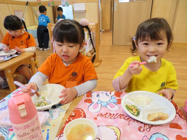 いつもとは違う環境に緊張した姿も見られましたが、時間が経つとお隣のお友だちとお話をして楽しんで食べていましたよ♡
