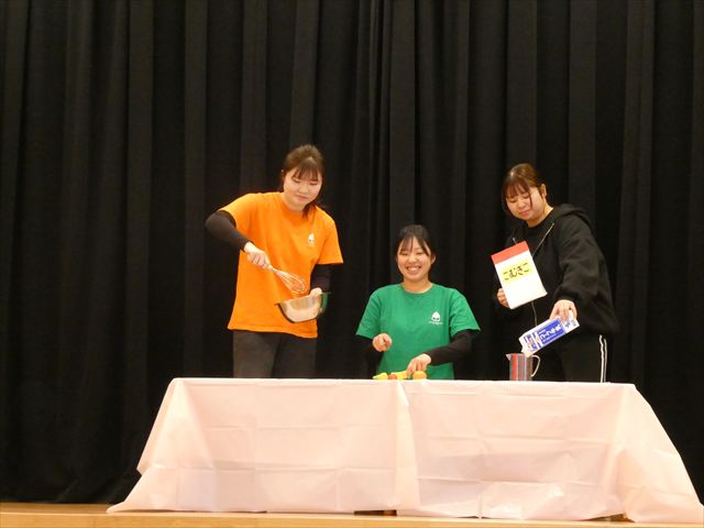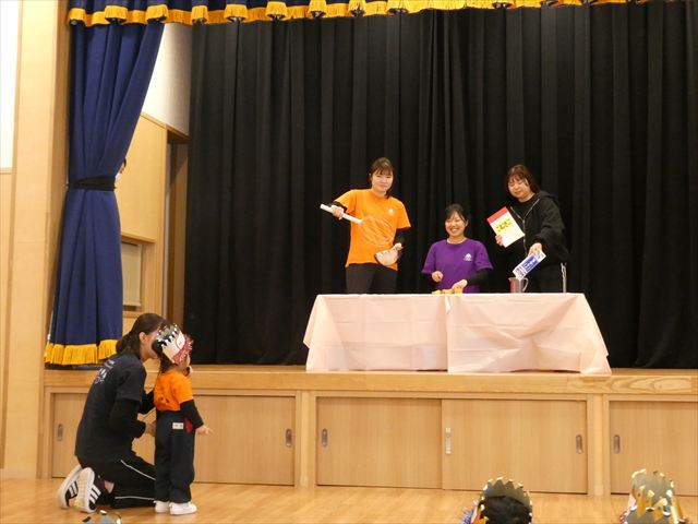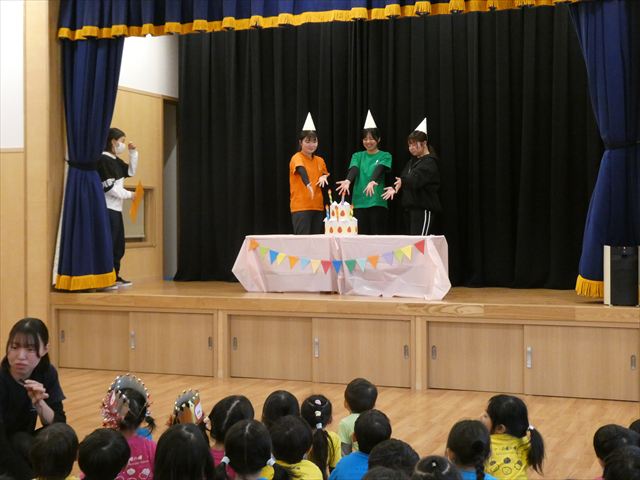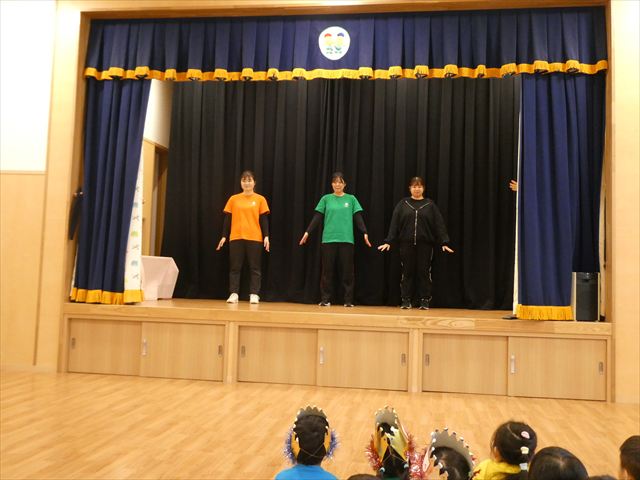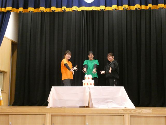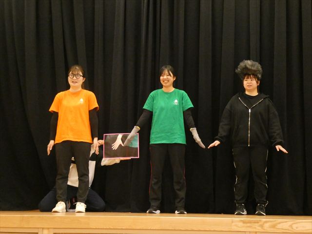 先生からの出し物は【間違い探し】でした!ステージの上に登場した3人の先生たち。一度幕が閉まり、再び開くとどこかが変わっているというものでした!