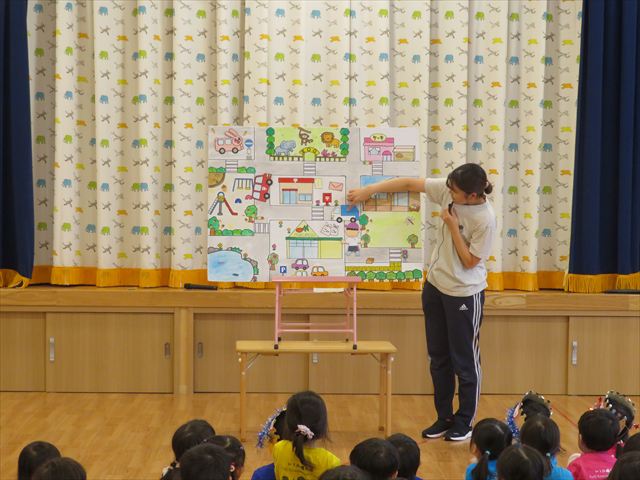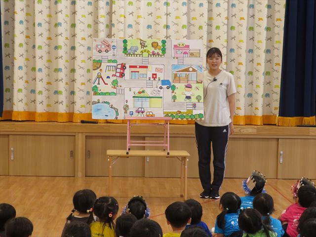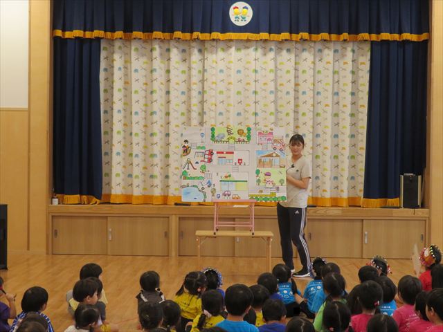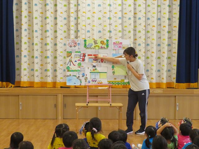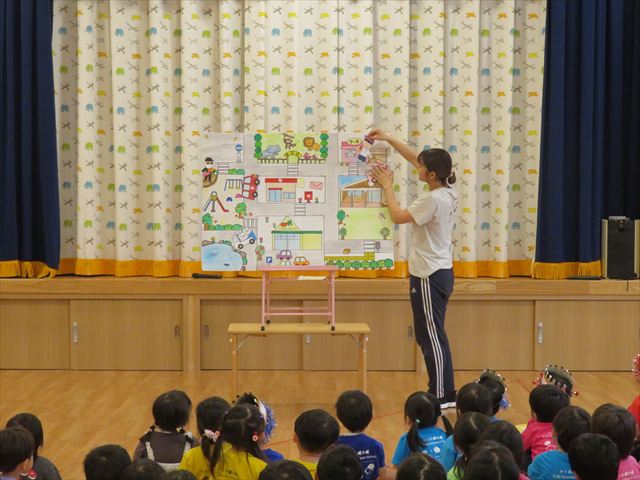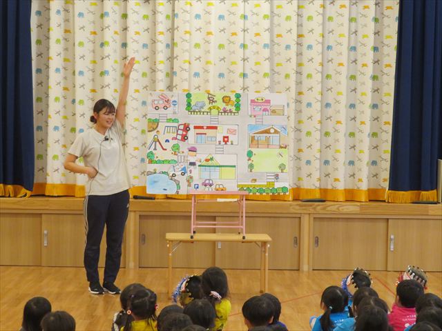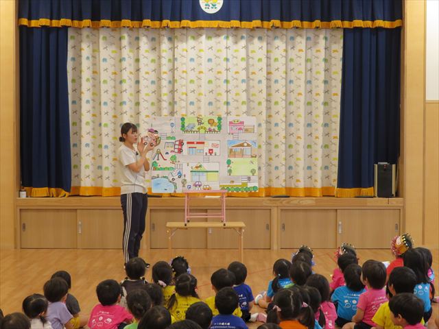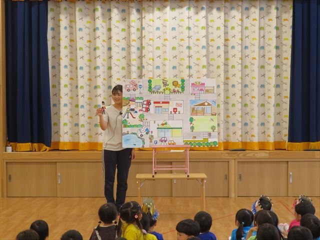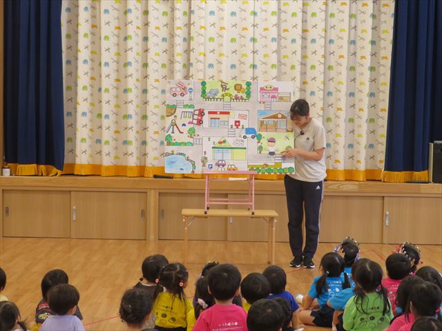 保育園を出発したきららくん!目的地であるケーキ屋さんまでの道中、色々なお約束やルールをクイズ形式で行い、子どもたちは張り切って参加していました(^-^)