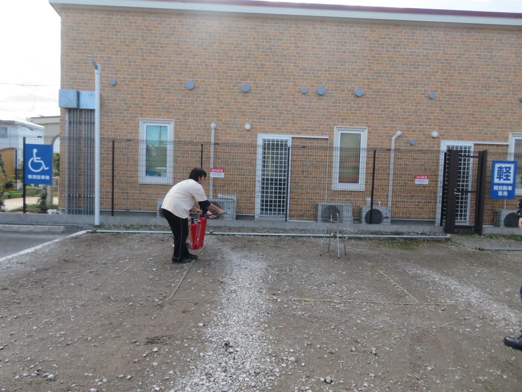 近隣からの火災を想定し、室内から駐車場へ避難すると、消防士さんと消防車が!!