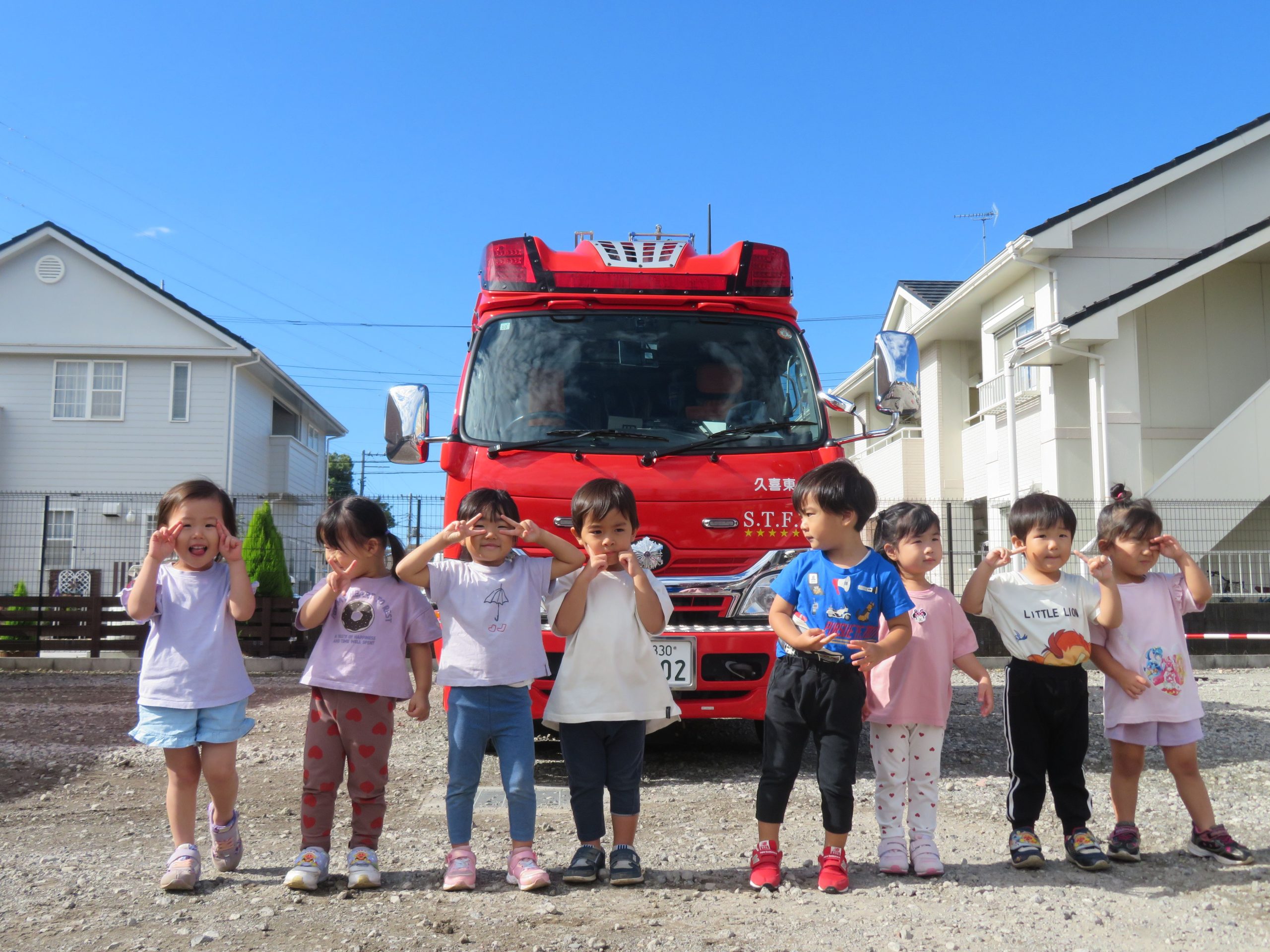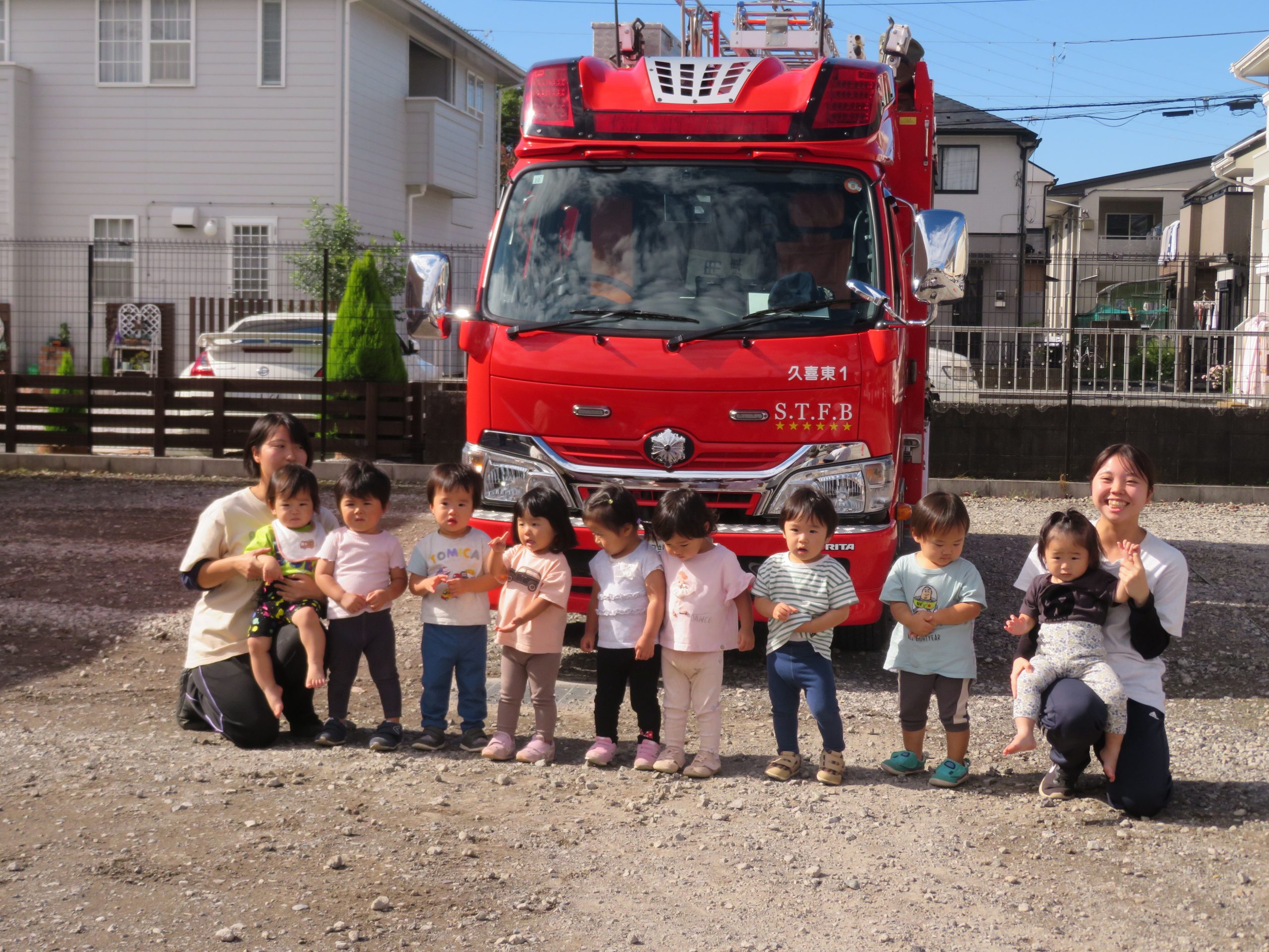 みんなの大好きな消防車に「すごーい!」と大喜びでした!消防士さんのお話をしっかりと聞き、消防車の前で集合写真を撮らせて頂きました✨