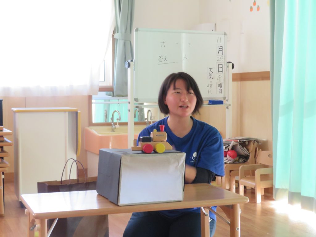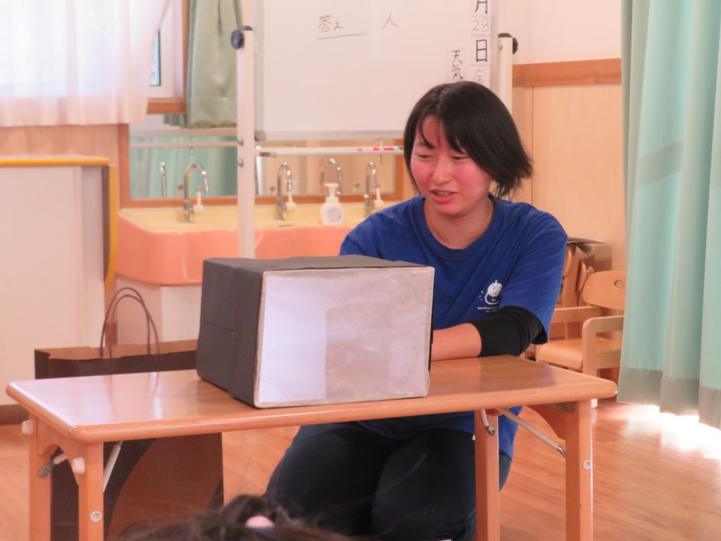 箱の中に映し出されるシルエットに、みんな初めは驚いていましたが、「あ!コップだ!」「次は何だろう?」と興味深々に見て予想していました♪