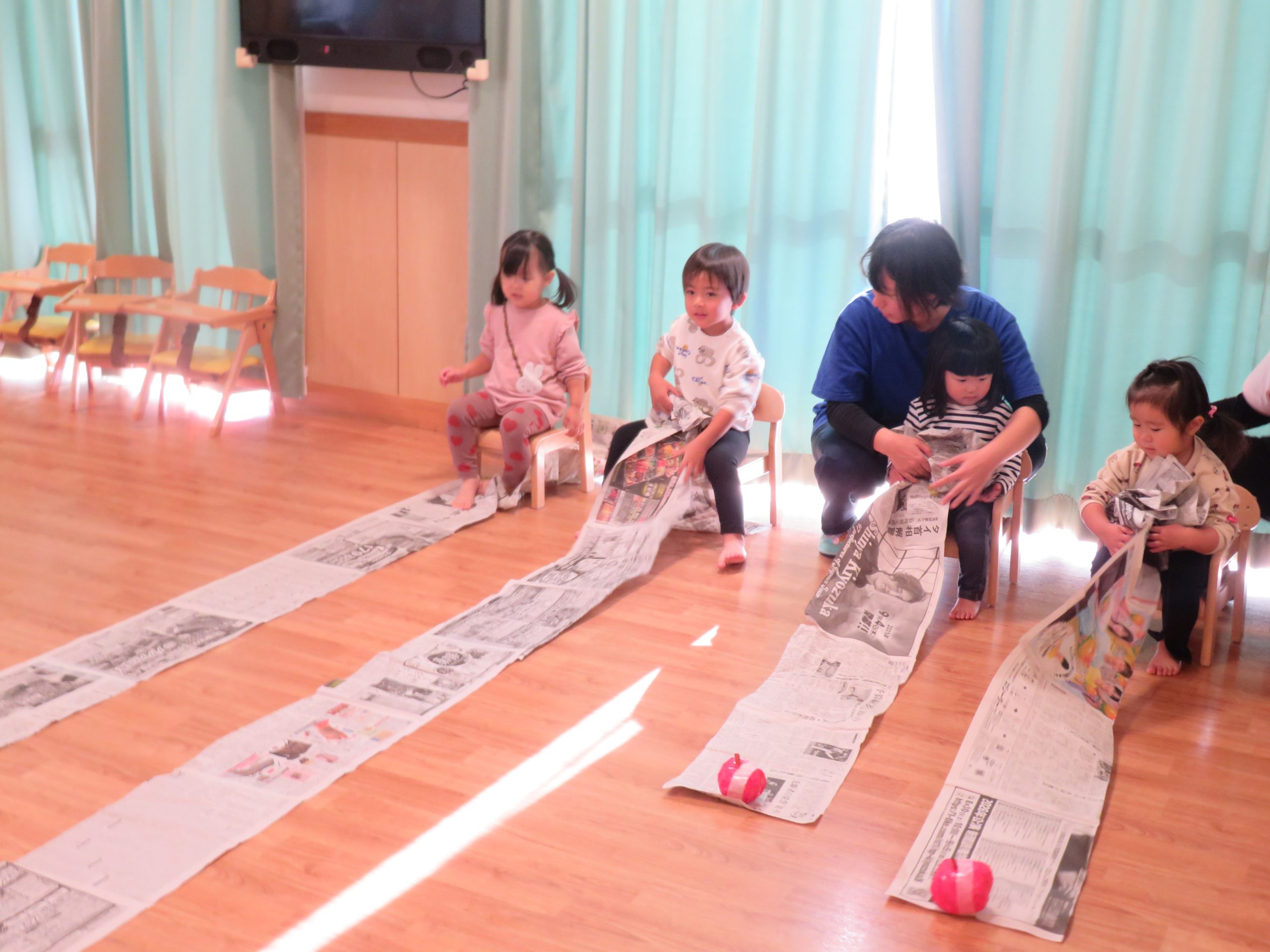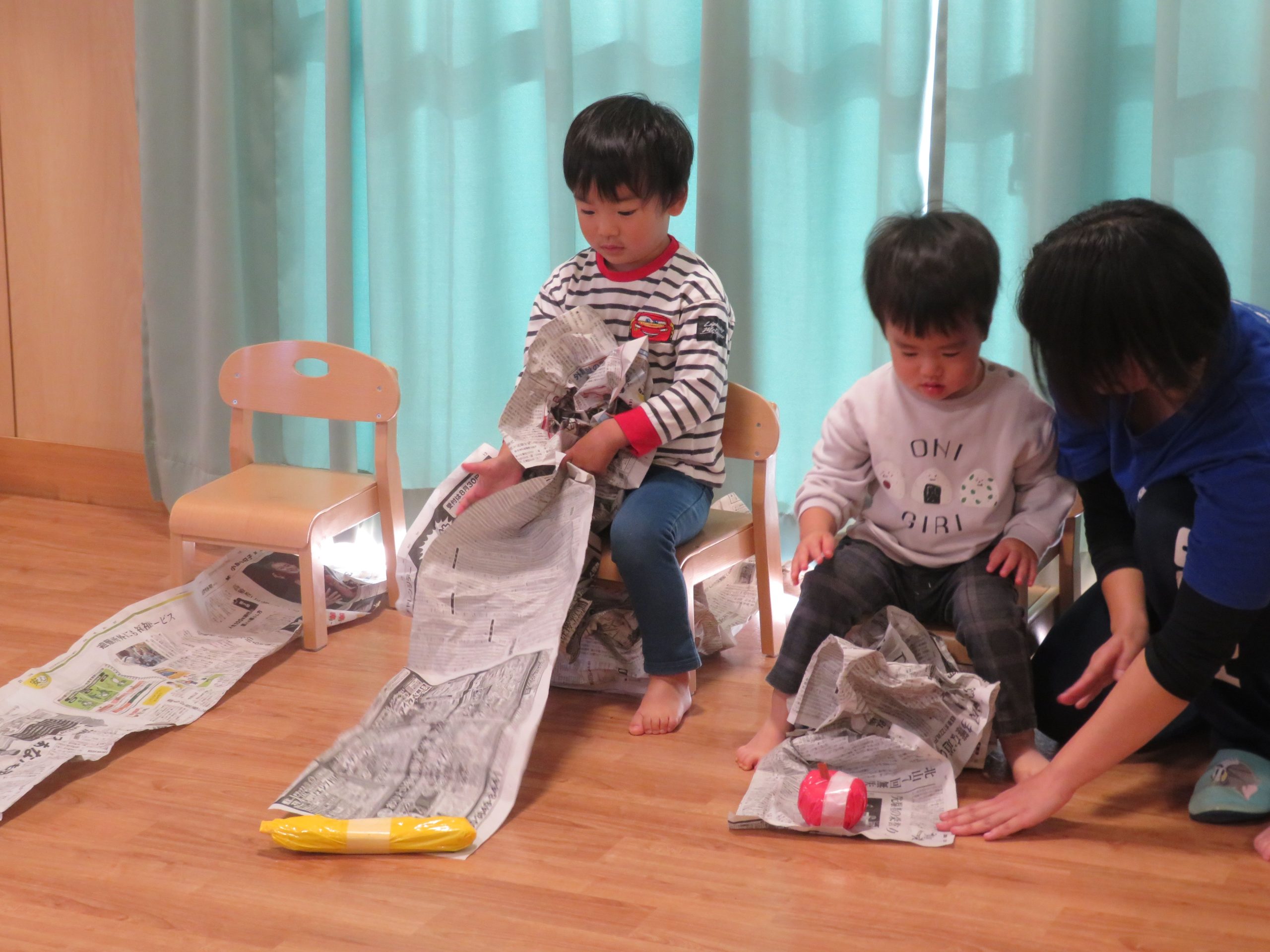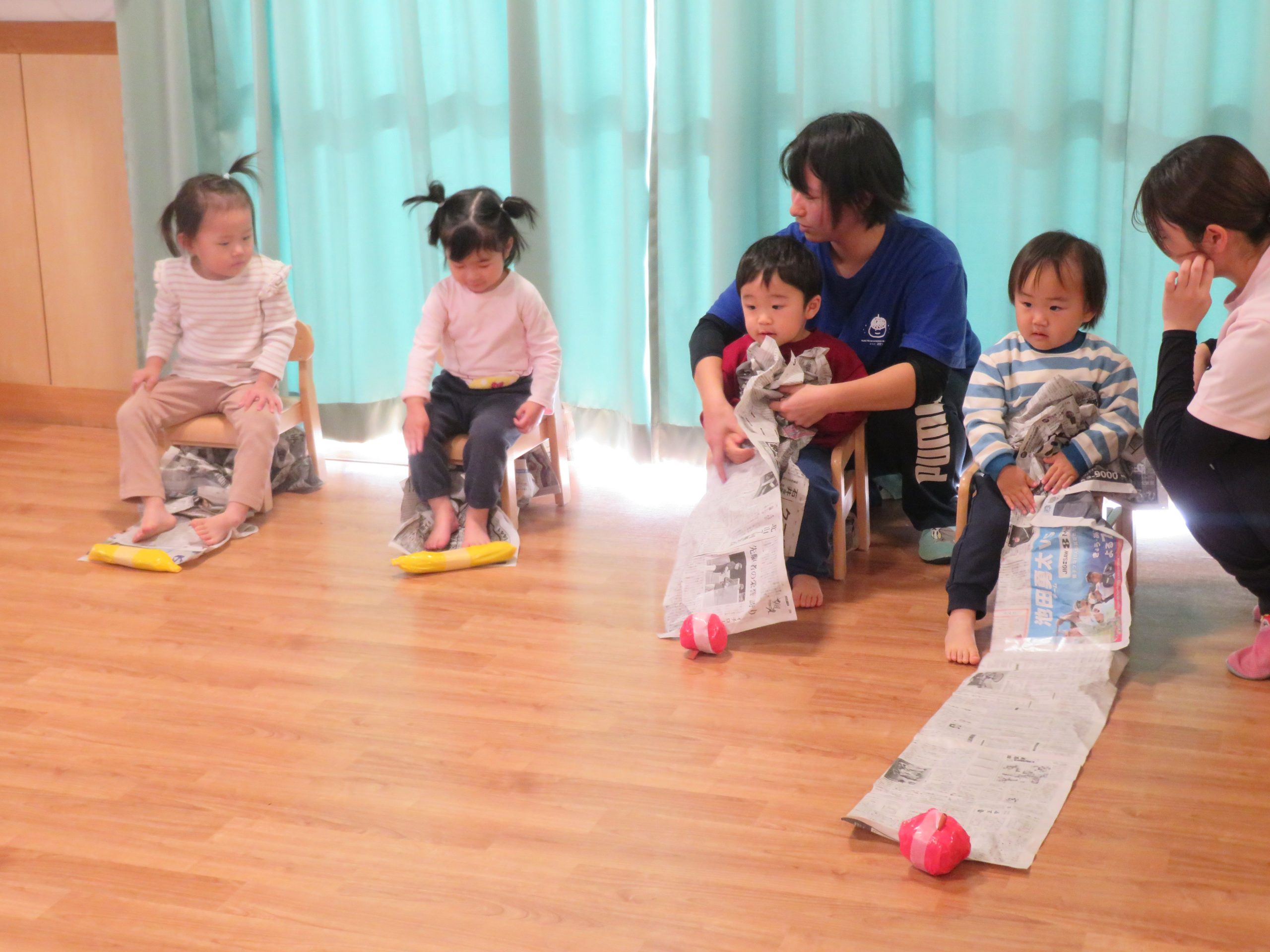 11月は、お誕生日のお友達がいなかった為、お楽しみ会として『シルエットクイズ』と『新聞引っ張りゲーム』を行いました!