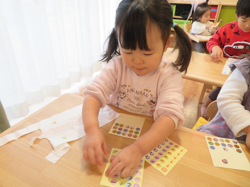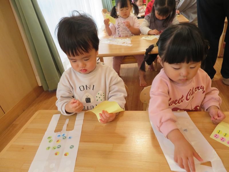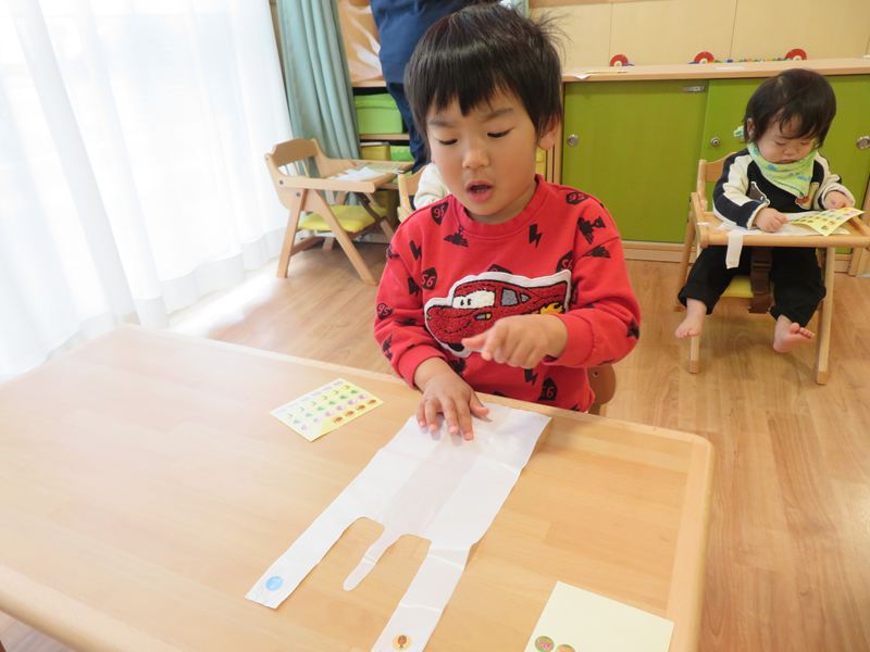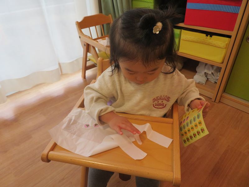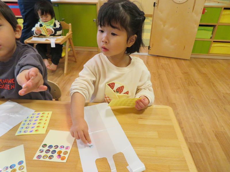 「袋にシール貼るの?」と不思議そうにしながらも、それぞれ好きなシールを選んでペタリ♪