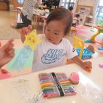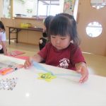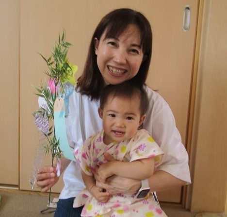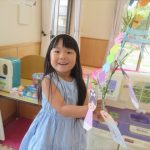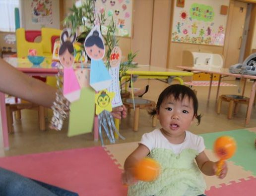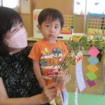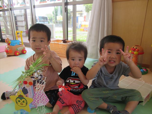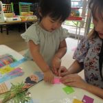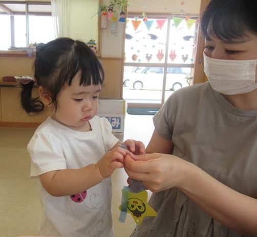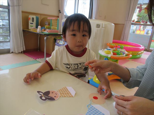 織姫と彦星は折り紙の着物に顔を貼ります。