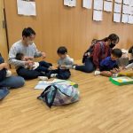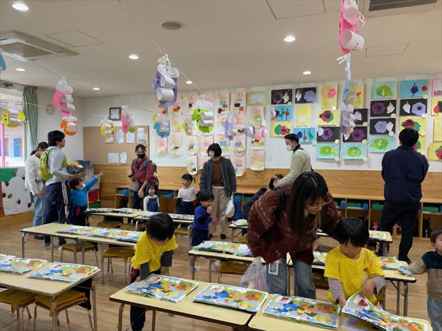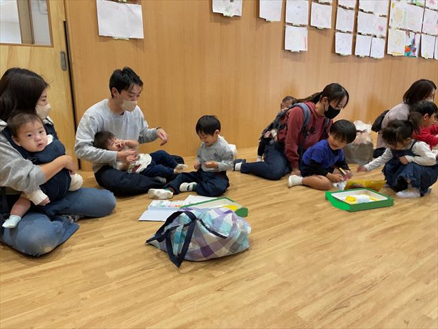 作品展では親子で飛び出すトンボを作りました。お家の方がそばに来てくれるとニコニコ笑顔になり、おしゃべりをしながら楽しそうに作っていました。出来上がったトンボを飛ばして遊び嬉しそうでした。