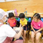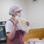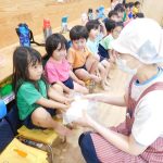 生地を触ったり、一人ずつ踏んだり、初めての体験で恥ずかしそうな表情を見せていましたが、この日の給食は特別に美味しく、たくさん食べていました。