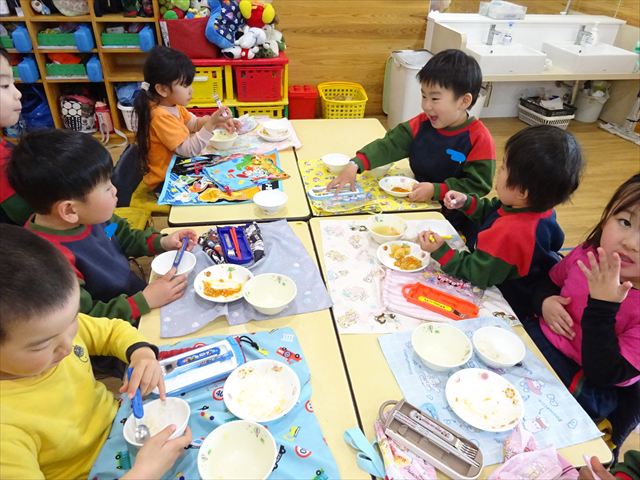 遊んだ後は給食。最近では食べる量が増え、完食するお友だちも増えました。いっぱい食べて大きくなーれ!