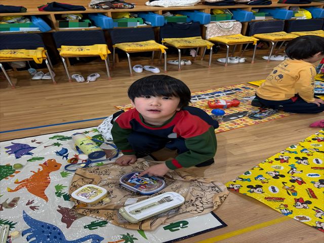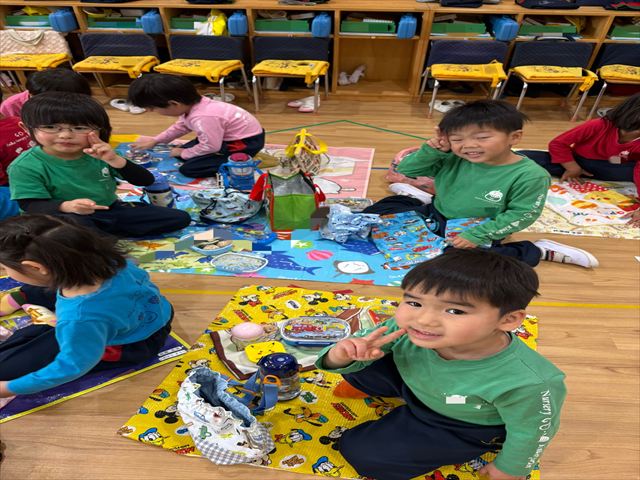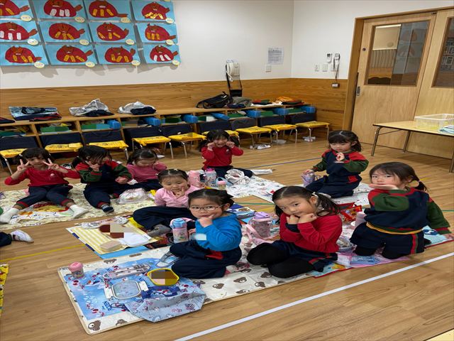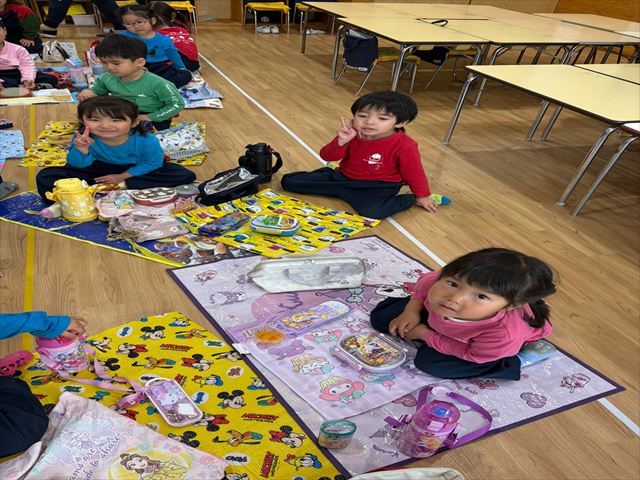 そして、お弁当の日は特別おいしい!レジャーシートを広げて、楽しく食べています。