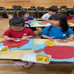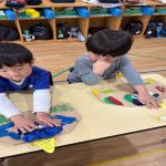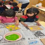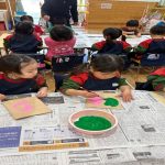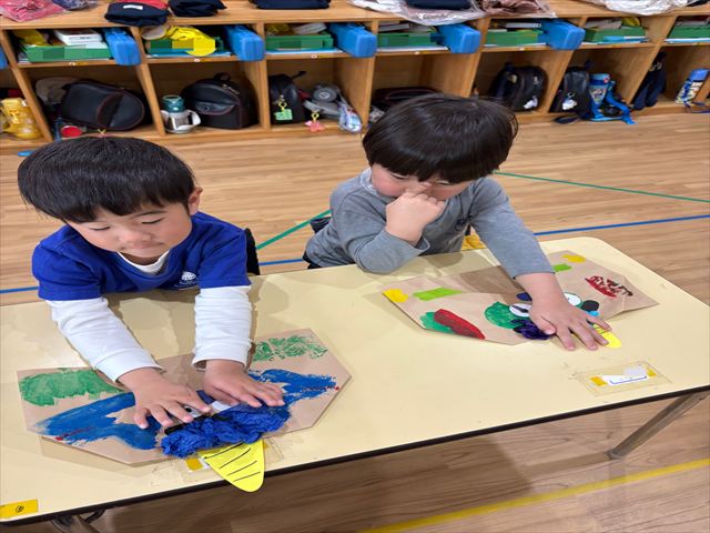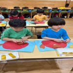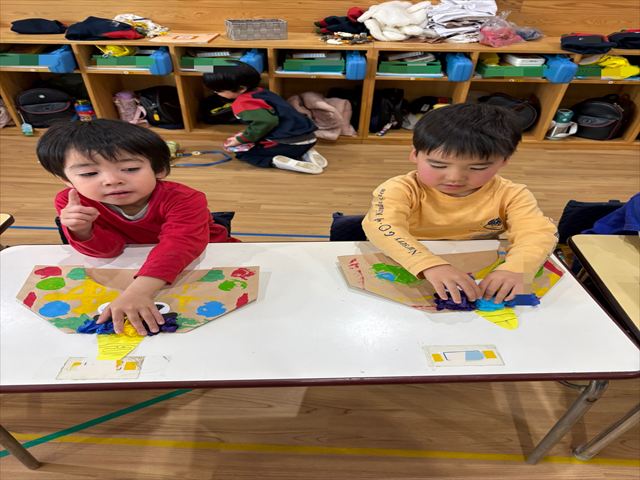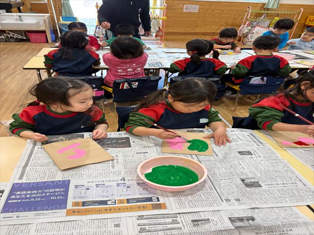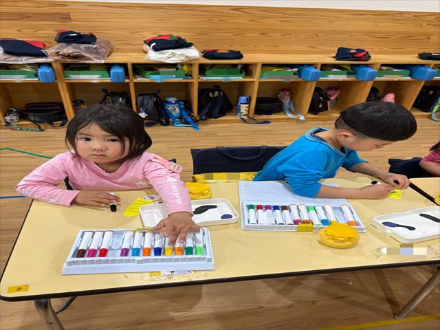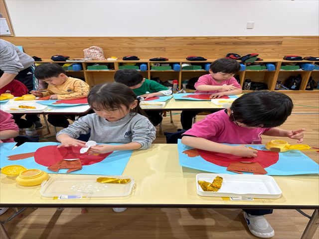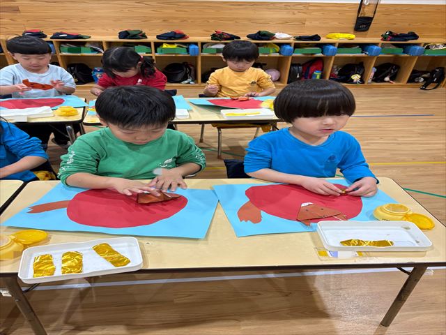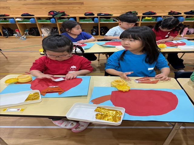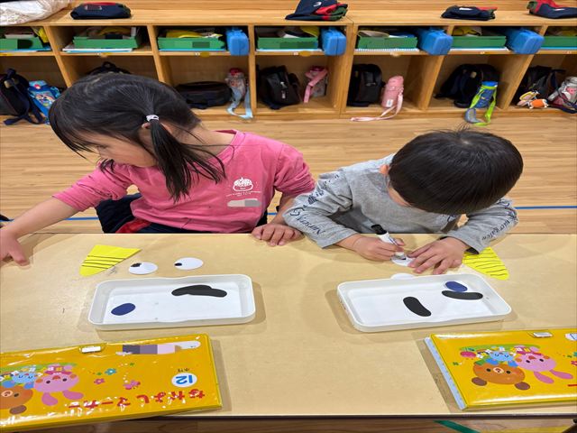 製作では、のりやはさみ、絵の具など様々なものを使って季節の製作に取り組んでいます。はさみでは大きい丸の形に挑戦したり、細かいパーツを切ったり、少しずつひとりで出来るようになり成長を感じています。
