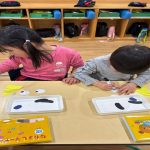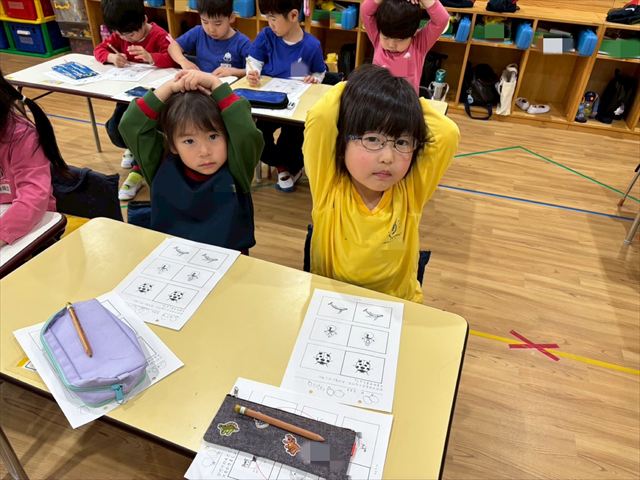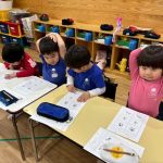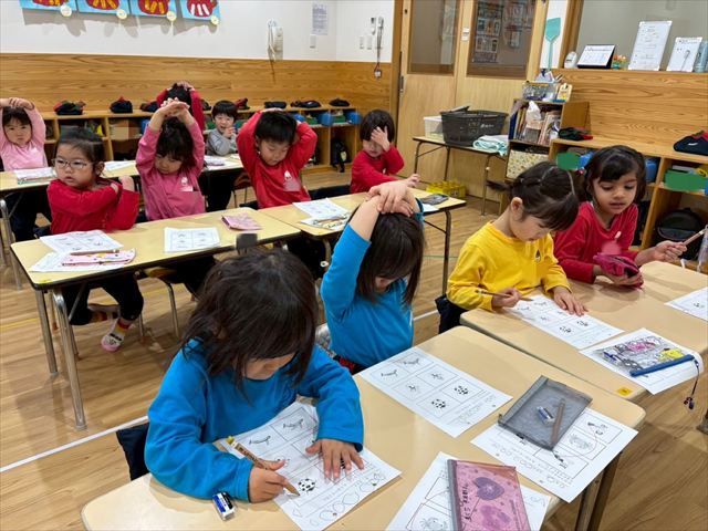 ちえプリントでは鉛筆の持ち方を意識し、名前の欄には自分の名前の数の丸を書いています。今では、すらすらと丸が書けるようになりました。問題を解くスピードも速くなり、自分の力で頑張っています。