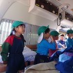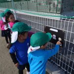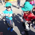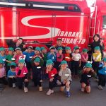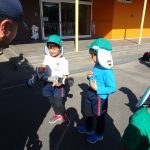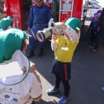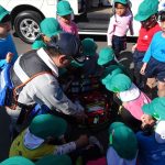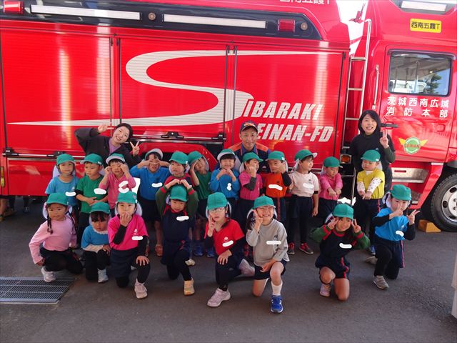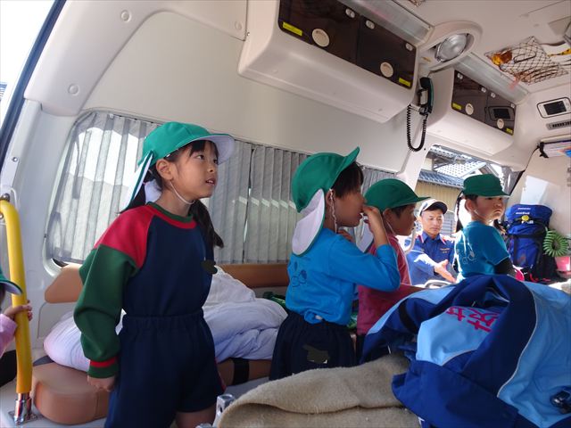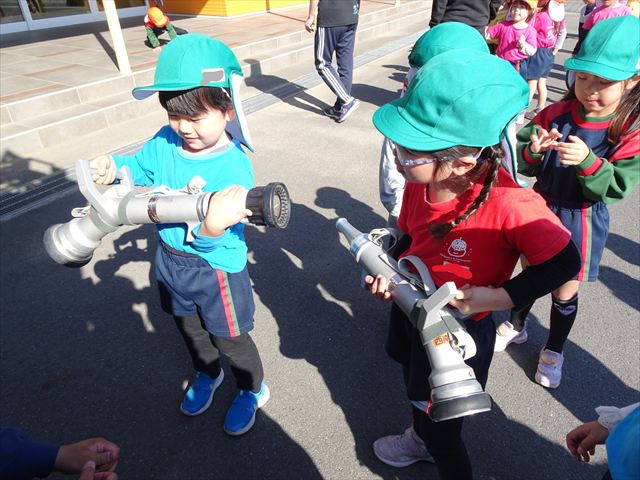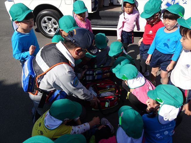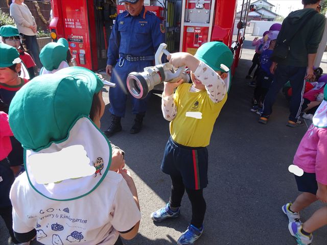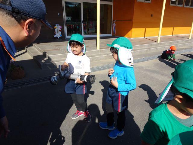 消火避難訓練があり、消防署の消防士さんたちのお話を聞きました。実際に使っているものを見せてもらったり触らせてもらいました。