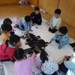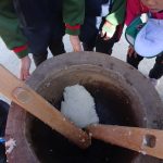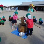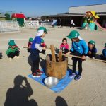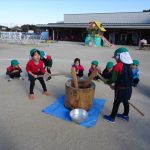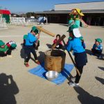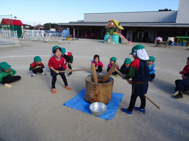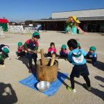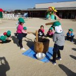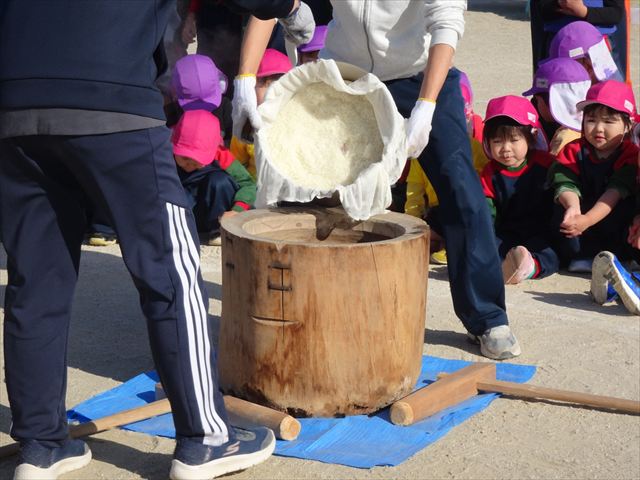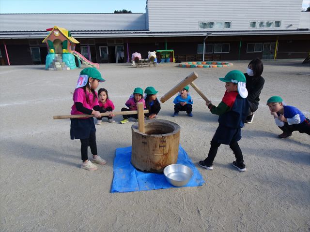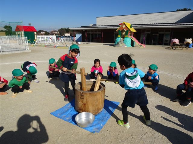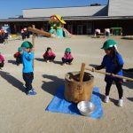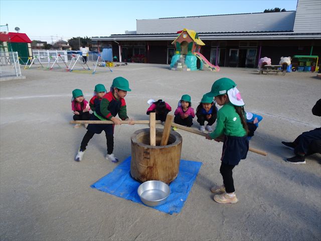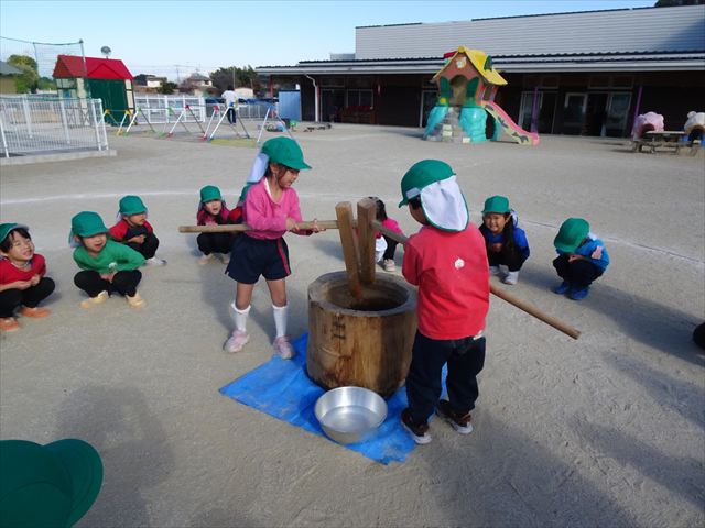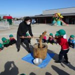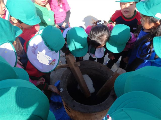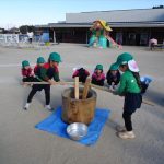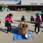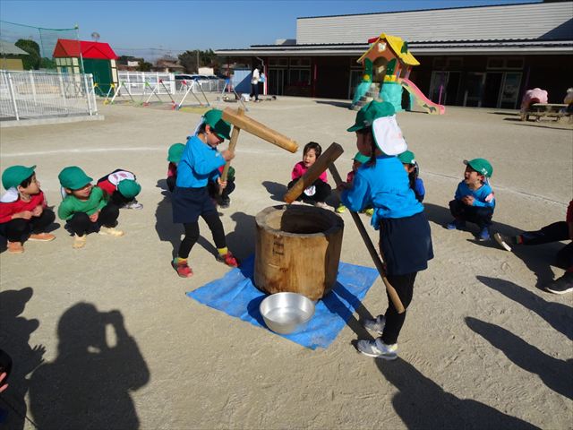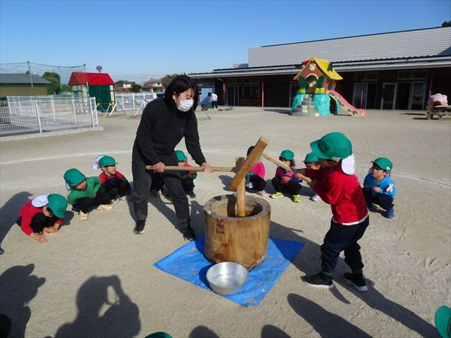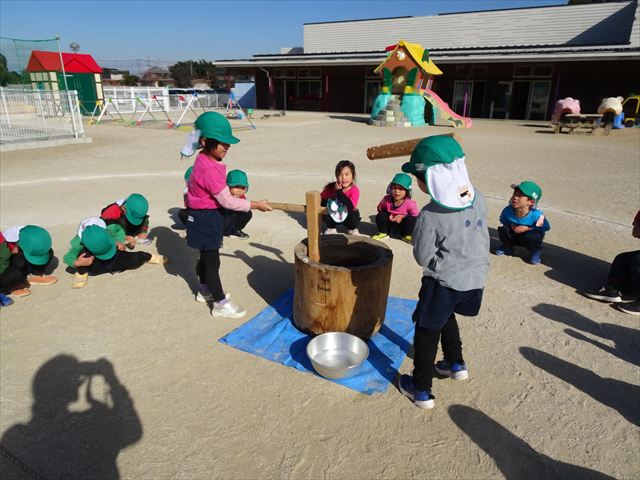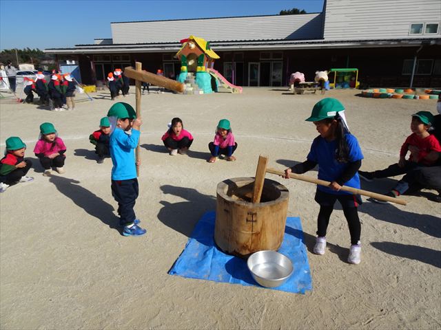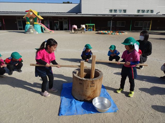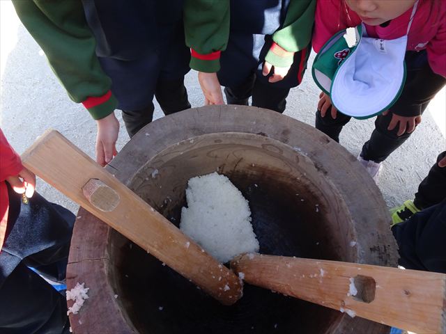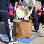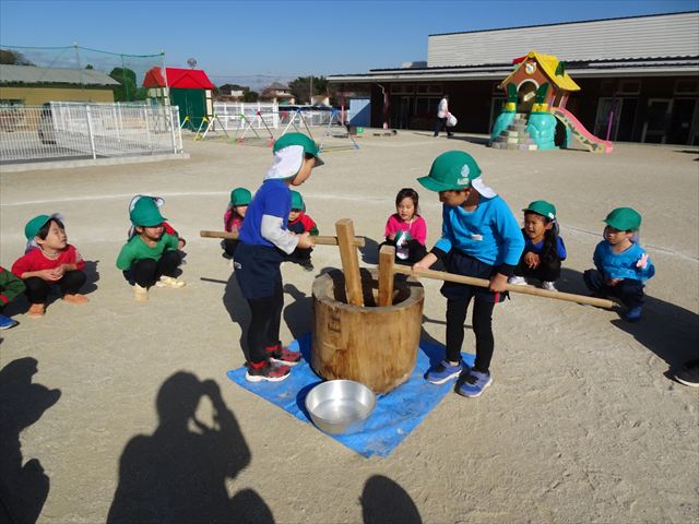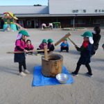 もちつきがありました。実際に杵を持つと「重い~」と言いながらも楽しく体験をしました。