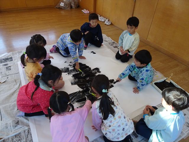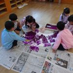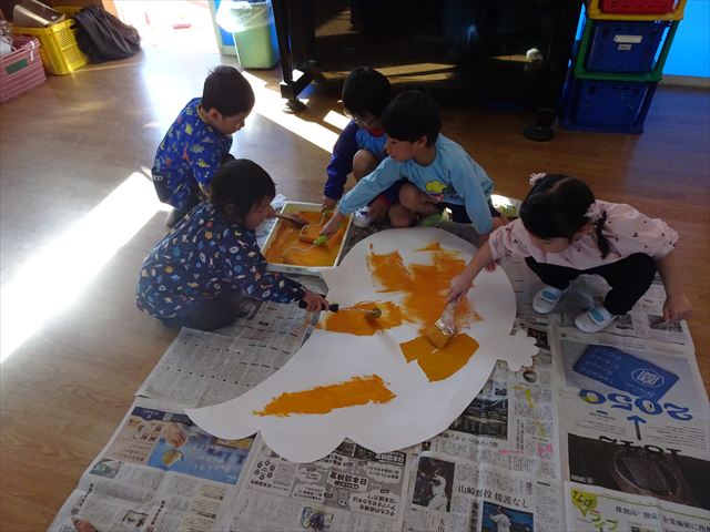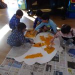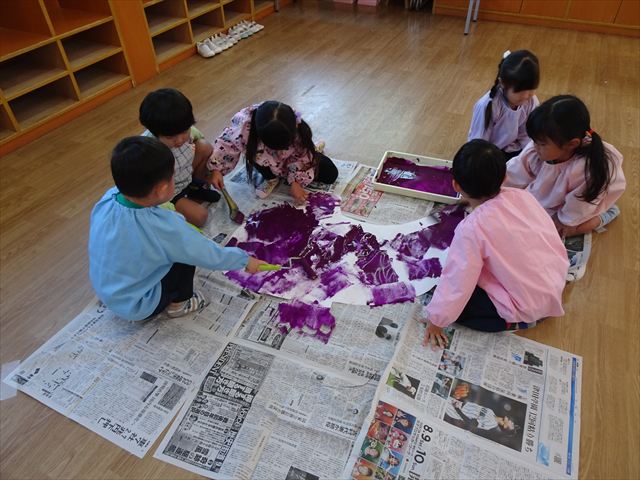 作品展の製作をしました。みんなで模造紙に絵の具を塗りました。