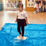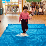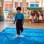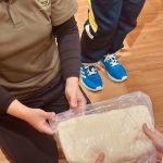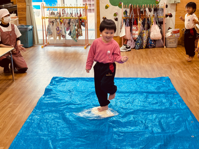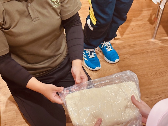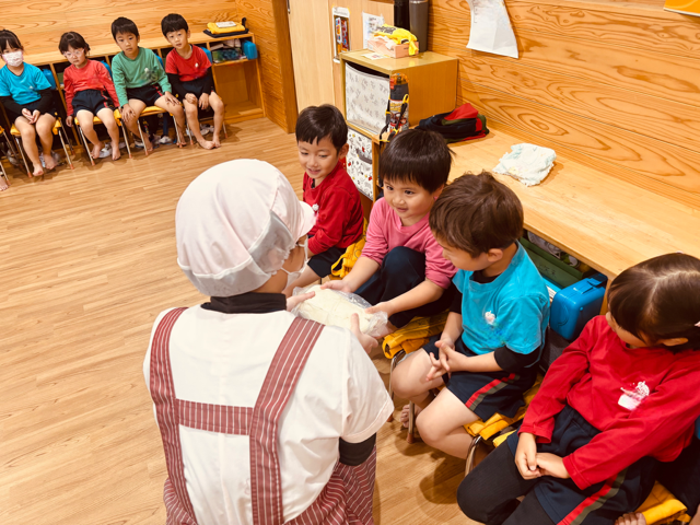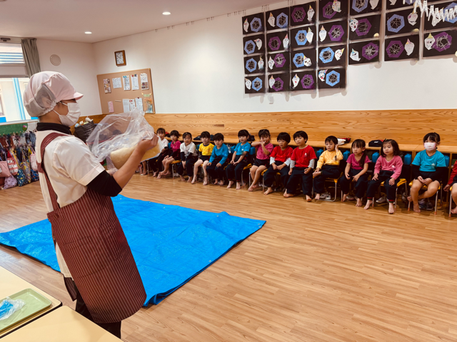 子どもたちにうどん生地を見せながら踏み方をお話して、