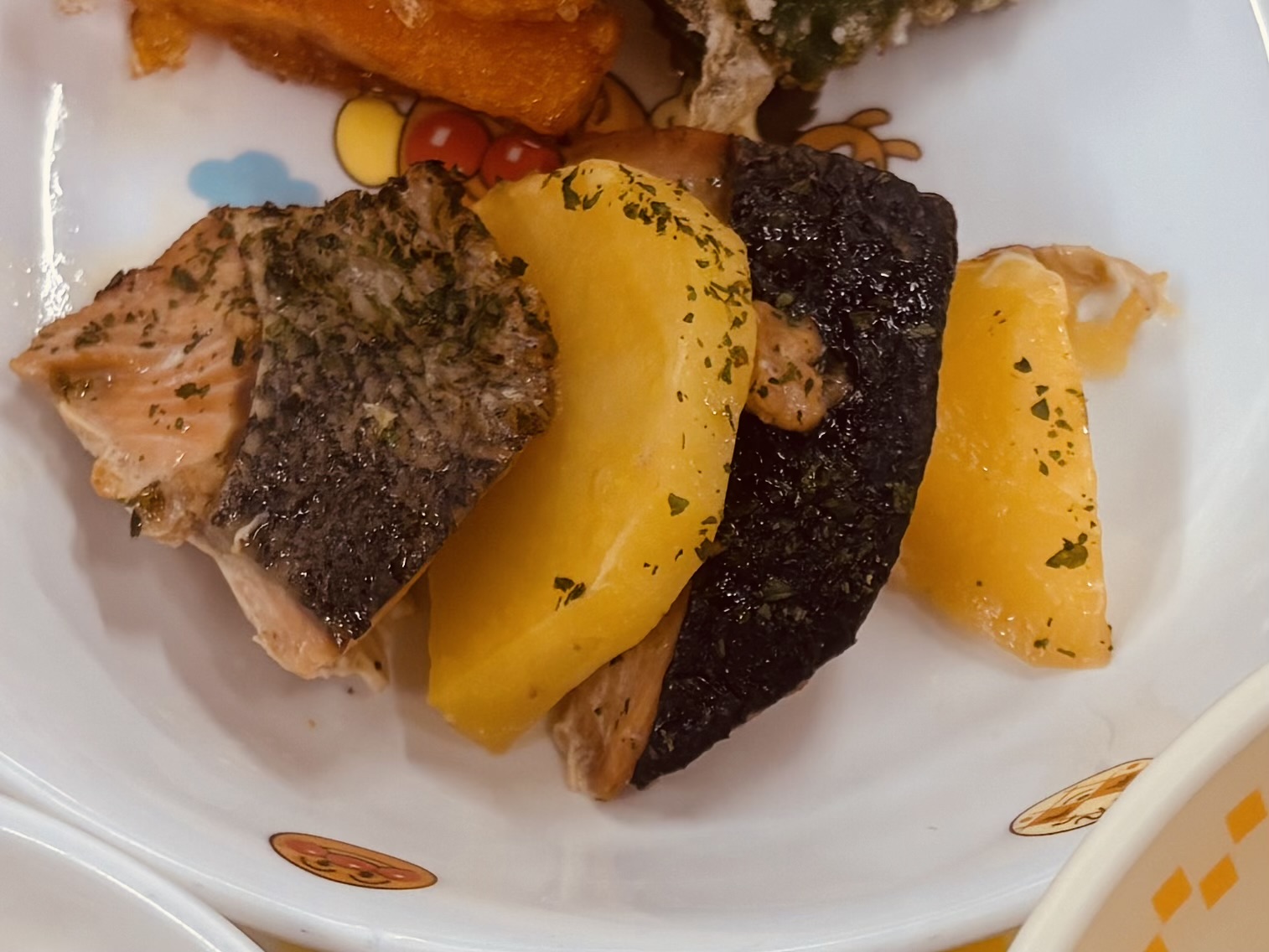 鮭とじゃがいもを重ねて焼くだけの簡単メニューですが、オーブン皿の
