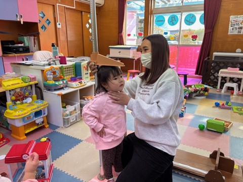 その後は製作を行いました。今回の製作は12月ということで、ツリー帽子を作りました。ツリーの帽子にタックシールを貼って楽しんでいました。