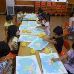 今日、のりを使っての活動です。朝きった紙を組み合わせてコスモスをつくりました。