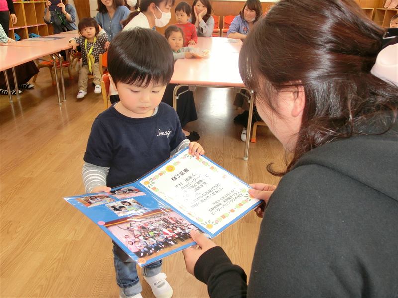 最後は先生たちから1年間頑張ったみんなにプレゼントです!幼稚園に入園しても先生たちのことを忘れないでね・・の気持ちを込めて・・・(笑)