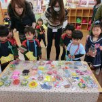 いつもの日課活動の後はみんなでお買い物ごっこです!今日はおうちの人と一緒なのでうれしそうなお友だち。自分で選んだり、お金をはらったり、なんだか頼もしいですね!