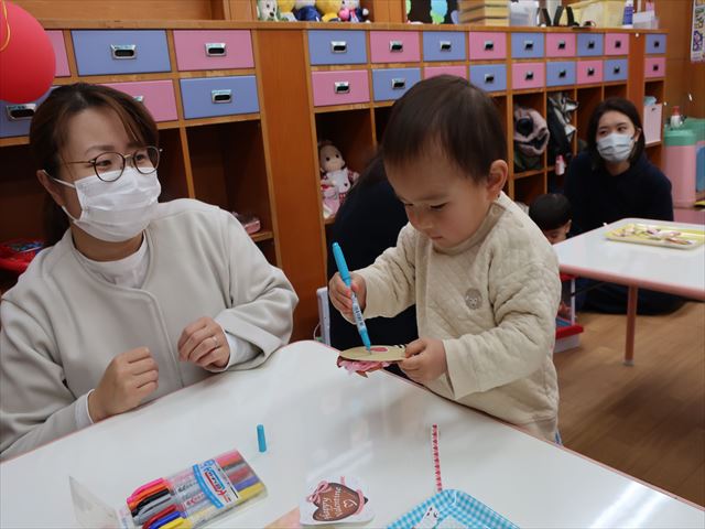 2月13日(月)はほほえみキッズルームイベント「バレンタインプレゼントを作ろう!」を行いました。翌日はバレンタインデー、皆さんパパさんにプレゼントの予定だそうです♡喜んでもらえたかな?