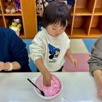 洗濯のりを入れて、食紅で色を付けて台紙に貼ったら…♪
