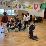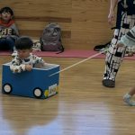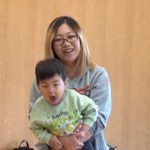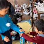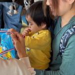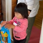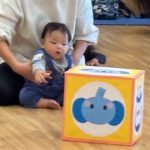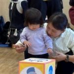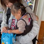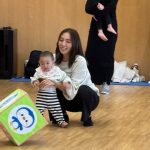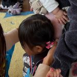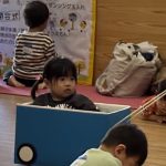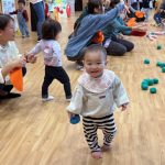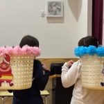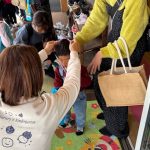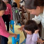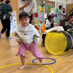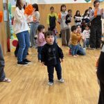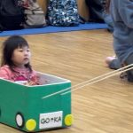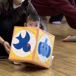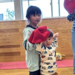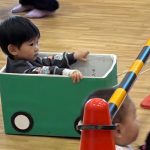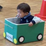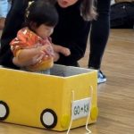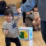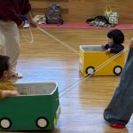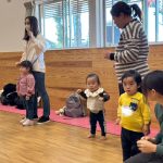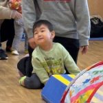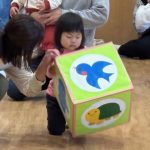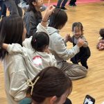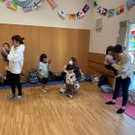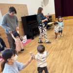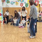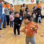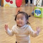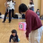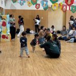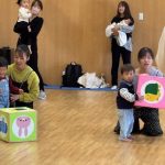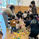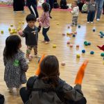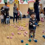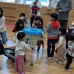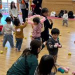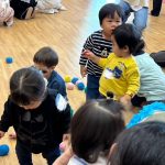 エビカニクスを踊って曲が止まったら玉入れスタート、ママさんたちも楽しそうにダンシング♪お友だちは夢中でかごに入れていました。