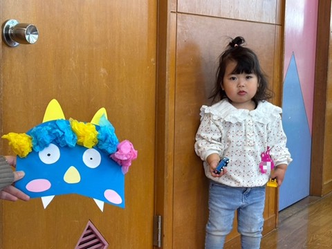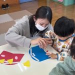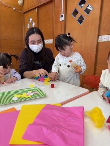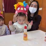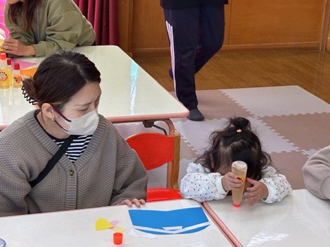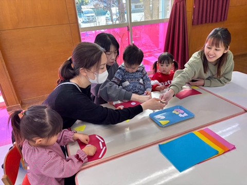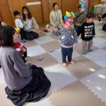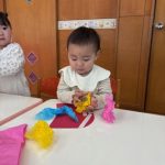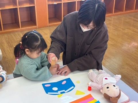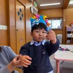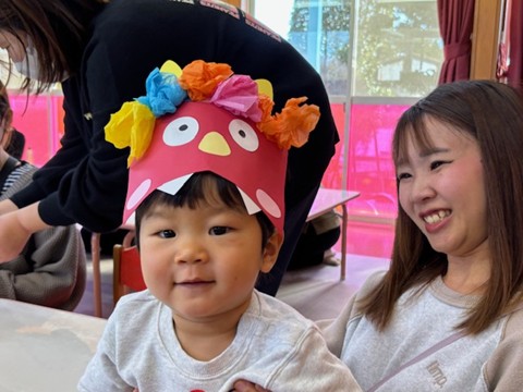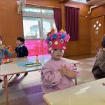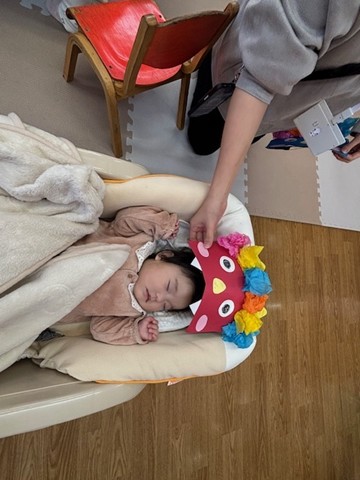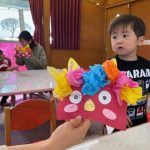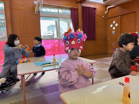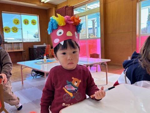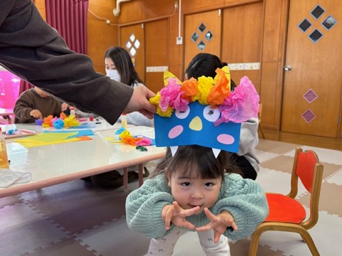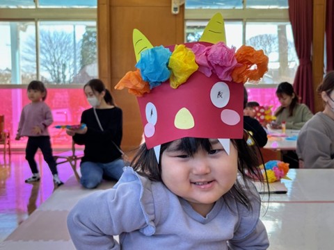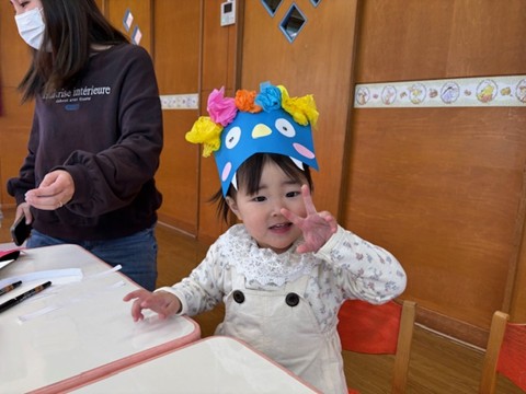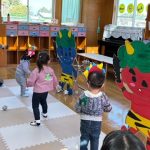 お面が完成したら、今度は新聞紙を丸めて豆の準備!準備が整ったら、鬼の登場!少し驚いてるお友だちもいましたが、泣くことなく元気に豆まきを行っている子もいました。