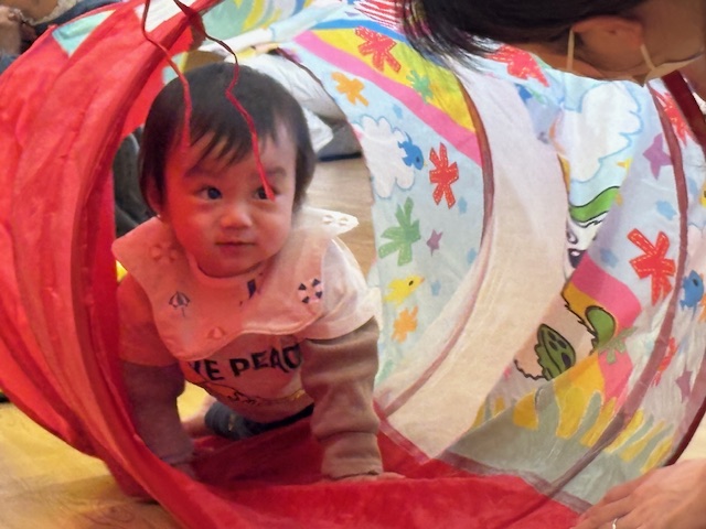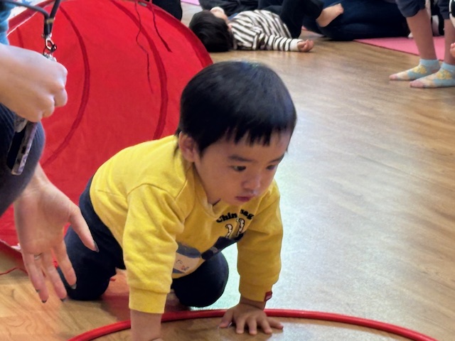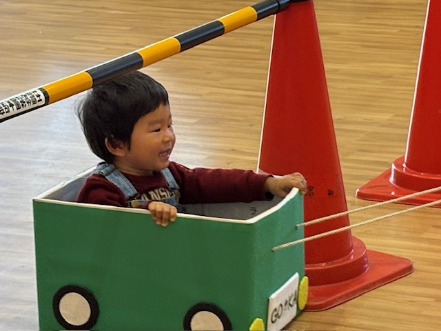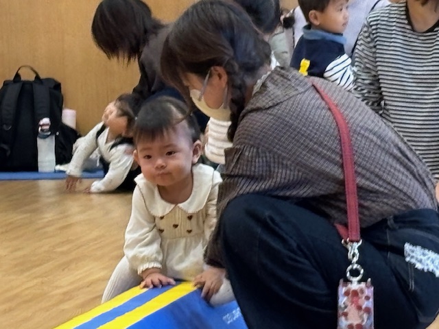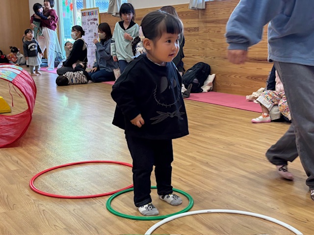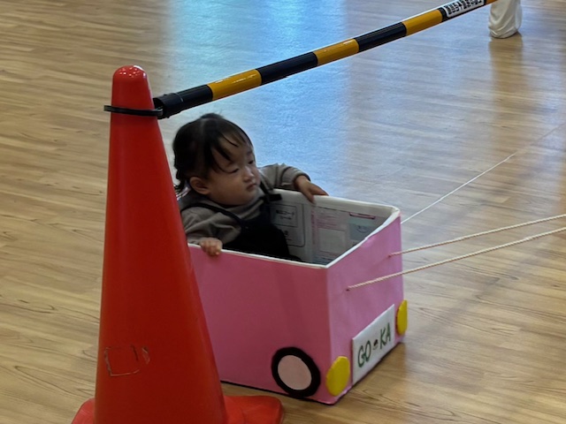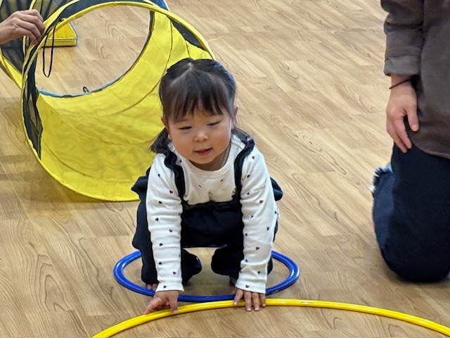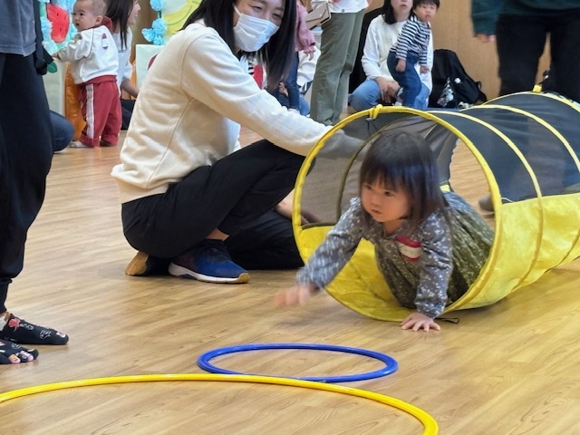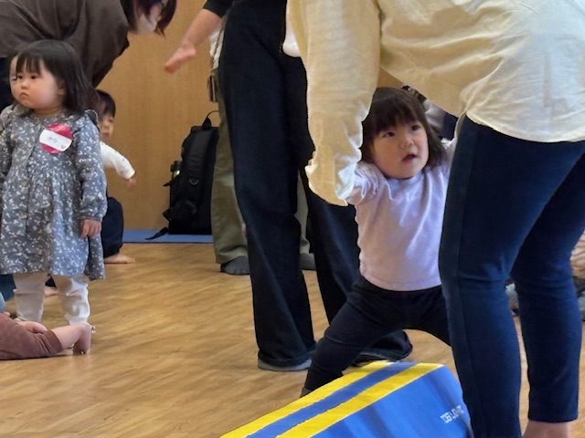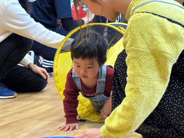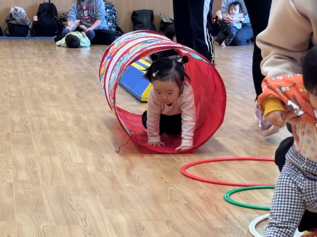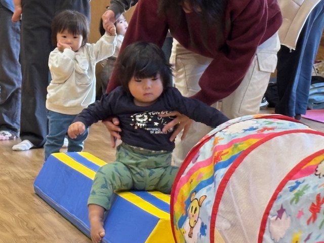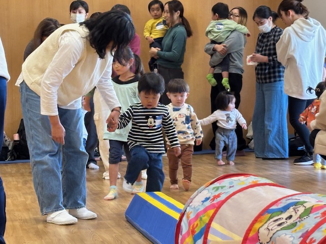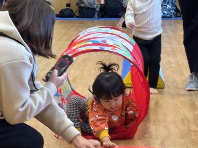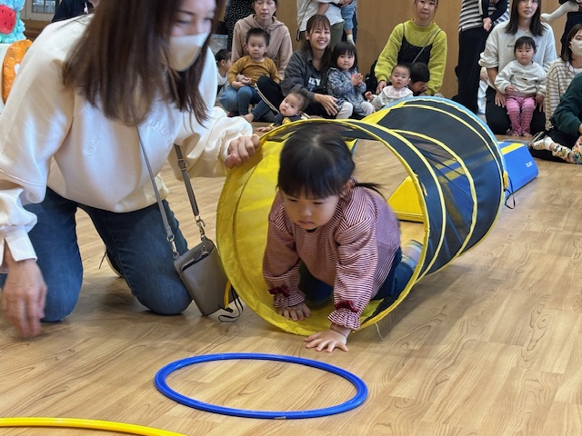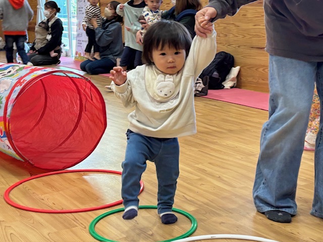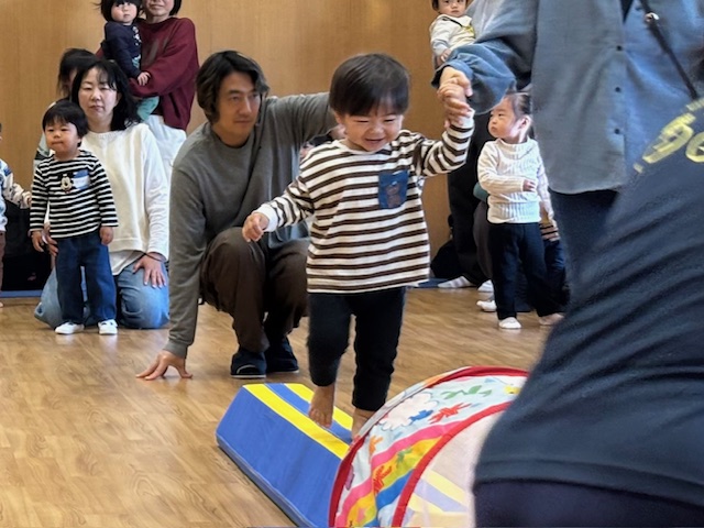 渡ってくぐってジャンプして、探検ごっこです。ママやパパと手をつないで元気にたんけんできたね!