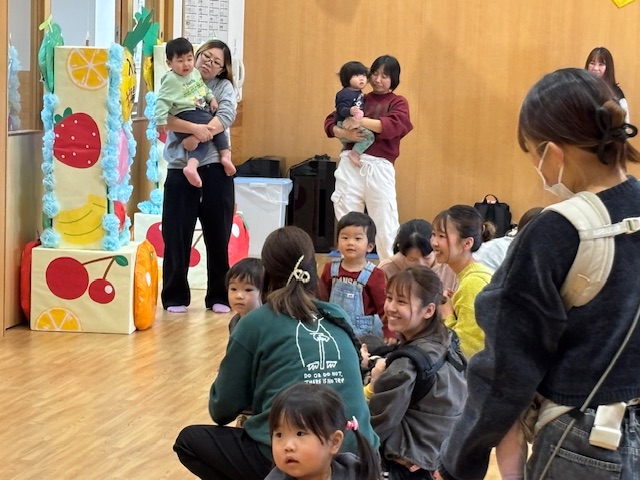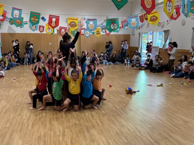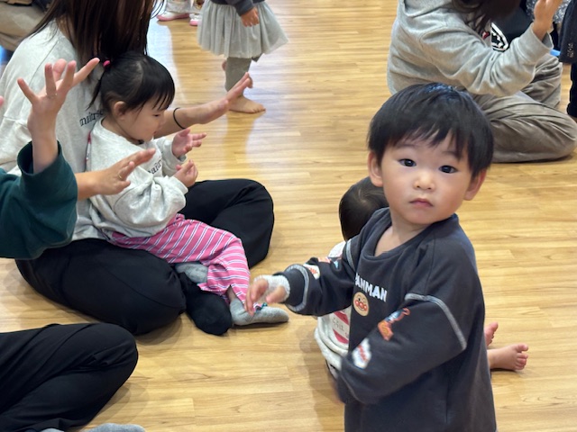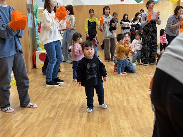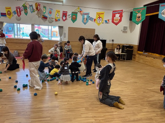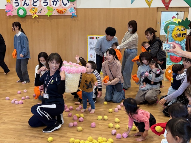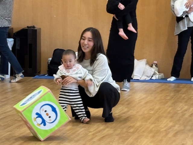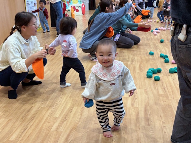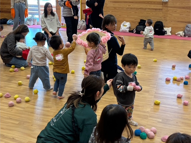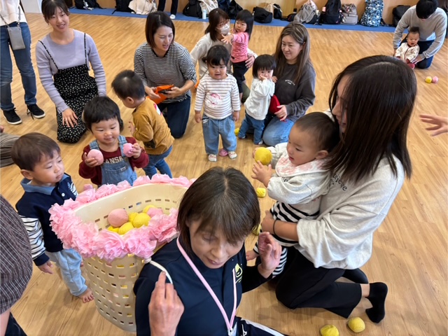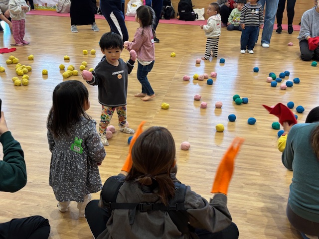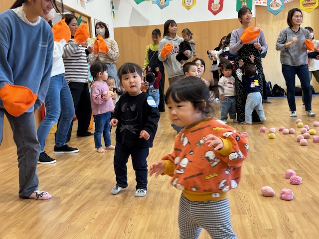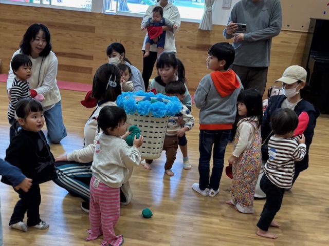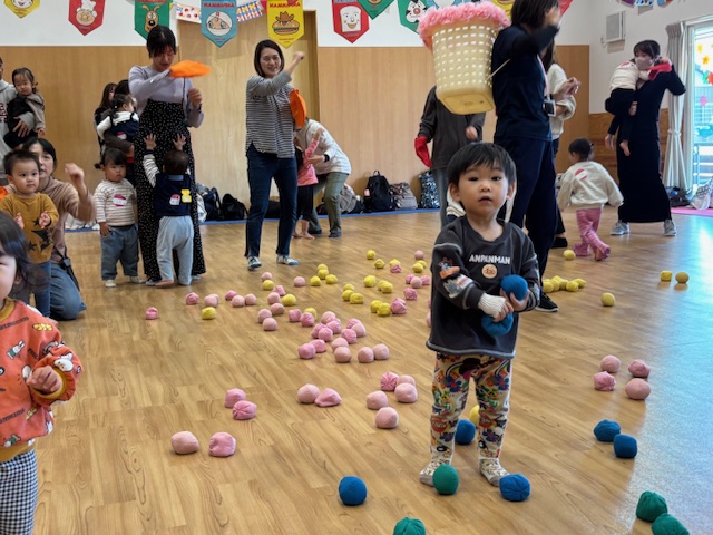 エビカニクスを踊って曲が止まったら玉入れスタート、ママさんたちも楽しそうにダンシング♪お友だちは夢中でかごに入れていました。