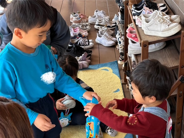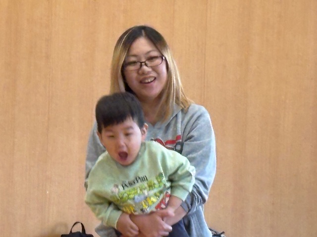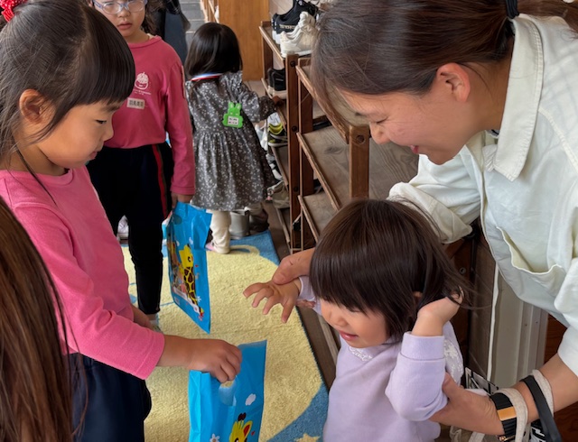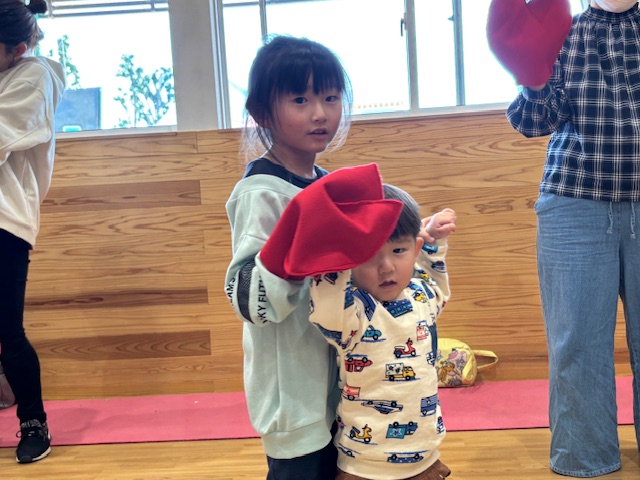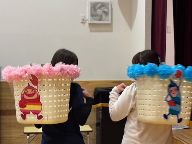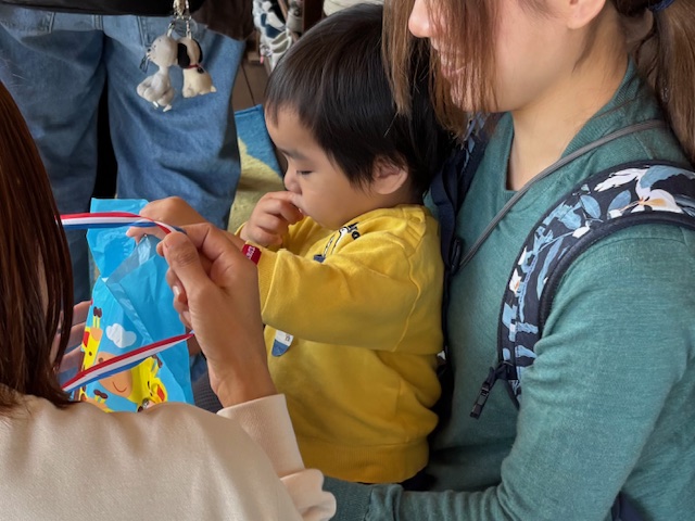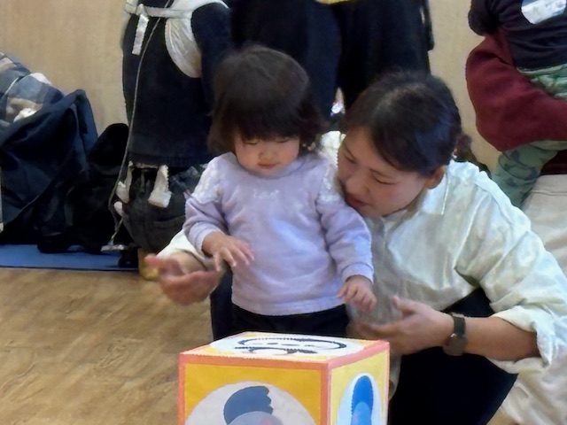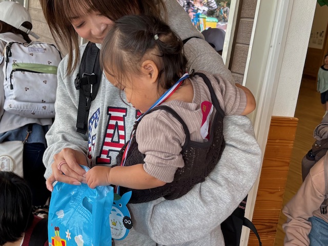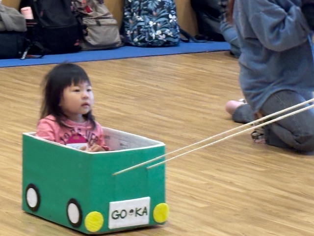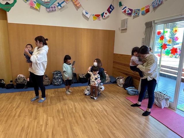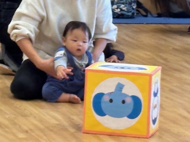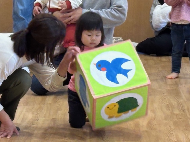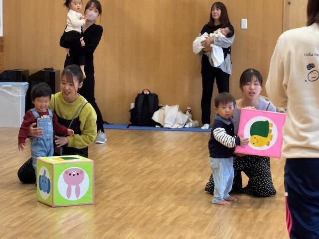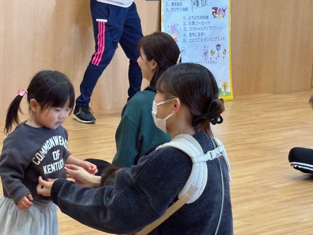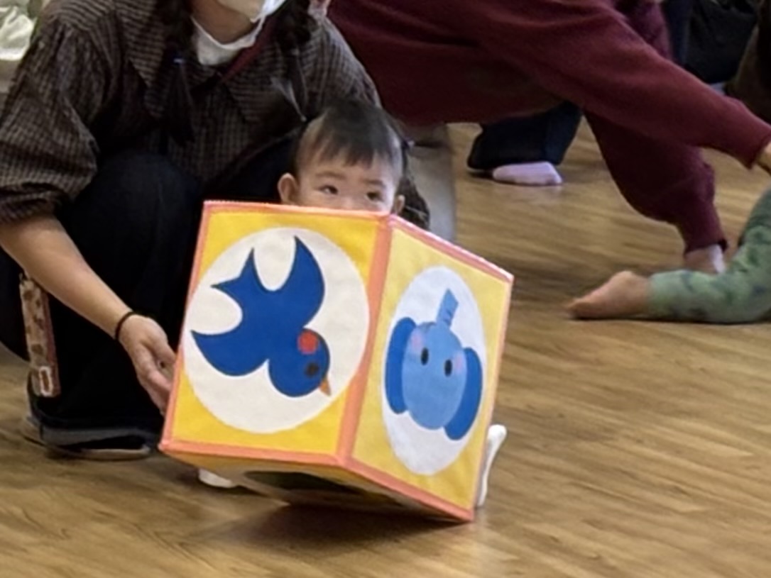 エビカニクスを踊って曲が止まったら玉入れスタート、ママさんたちも楽しそうにダンシング♪お友だちは夢中でかごに入れていました。