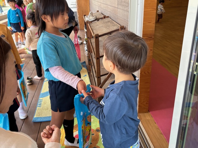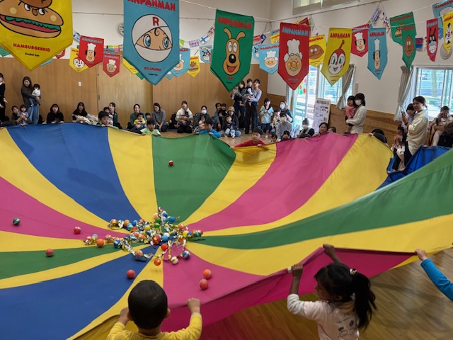 4歳児菫1組さんにパラバルーンの演技を披露してもらいました。運動会の演技の時からさらにパワーアップしていました!