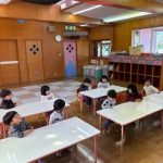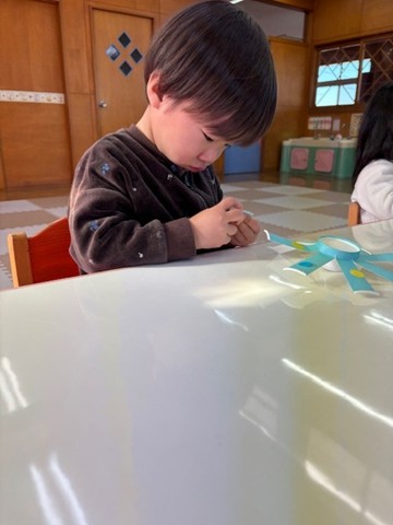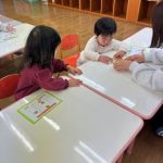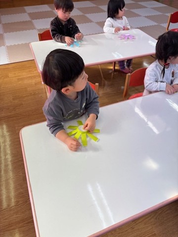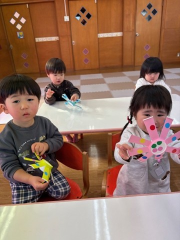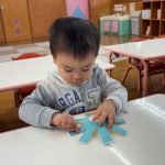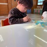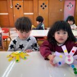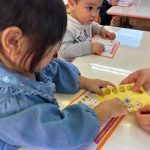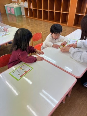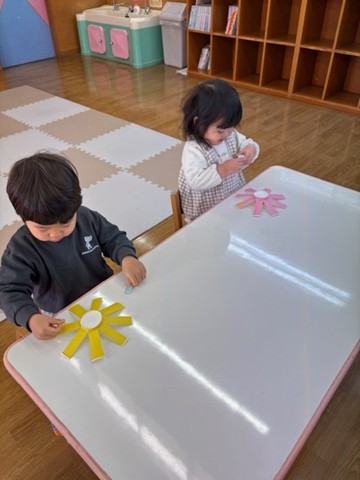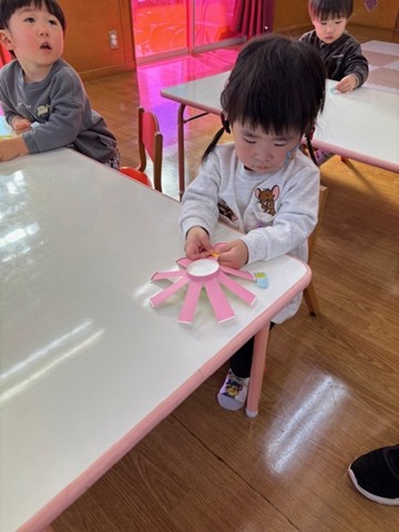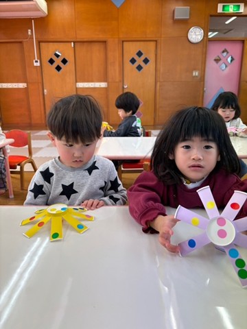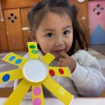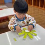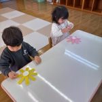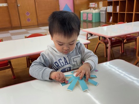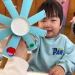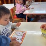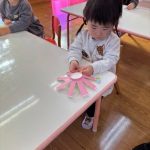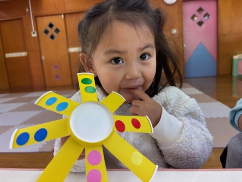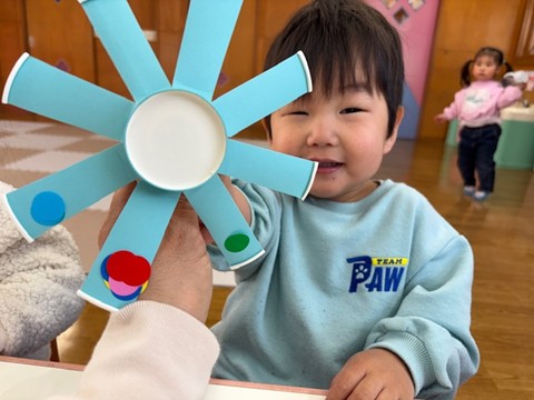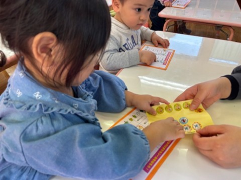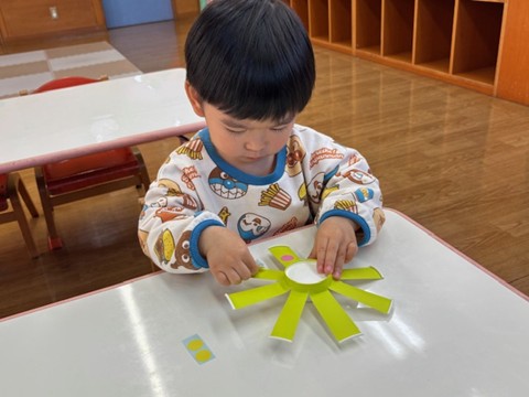シール帳にシールを貼るのが大好きなお友だち。アンパンマンのシールを自分で選び、シールも上手にはがして登園した日付に貼っていました。その後は、紙コップのコマにいろいろな色の丸シールを貼って模様を付けました。完成したコマを回して楽しく遊んでいました。