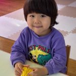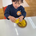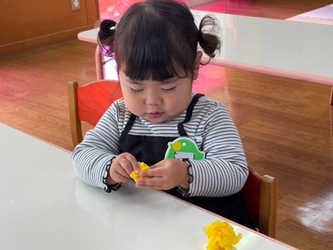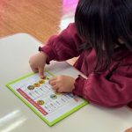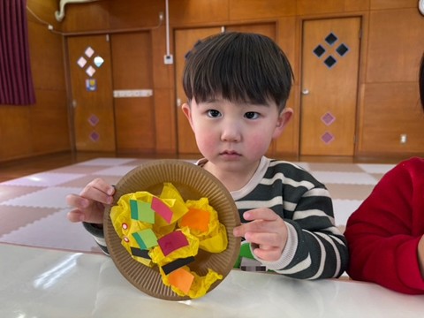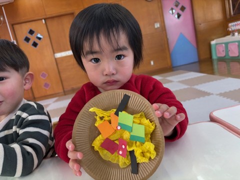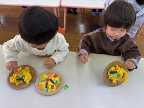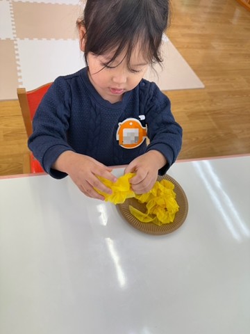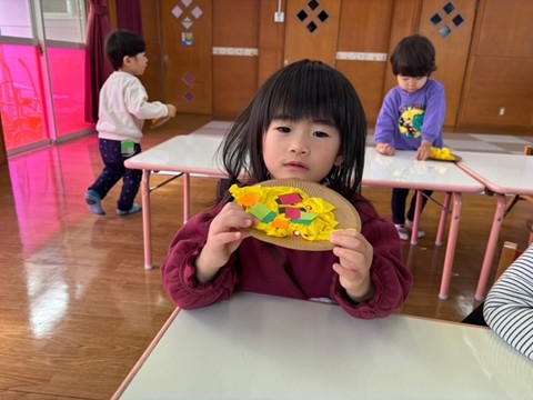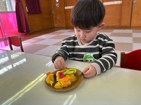 出席カードで手を挙げたり、シール帳にシール貼りを行ったり、席に座って集中して行っていました。また3月の製作は、「ちらし寿司」を作りました。黄色い花紙をご飯に見立て、サーモンやまぐろ、きゅうりなどを具材を夢中で貼っていました。